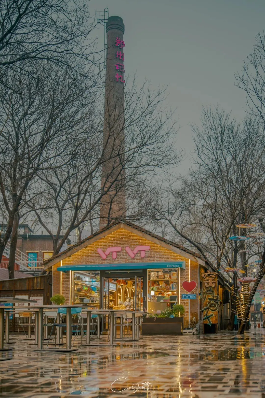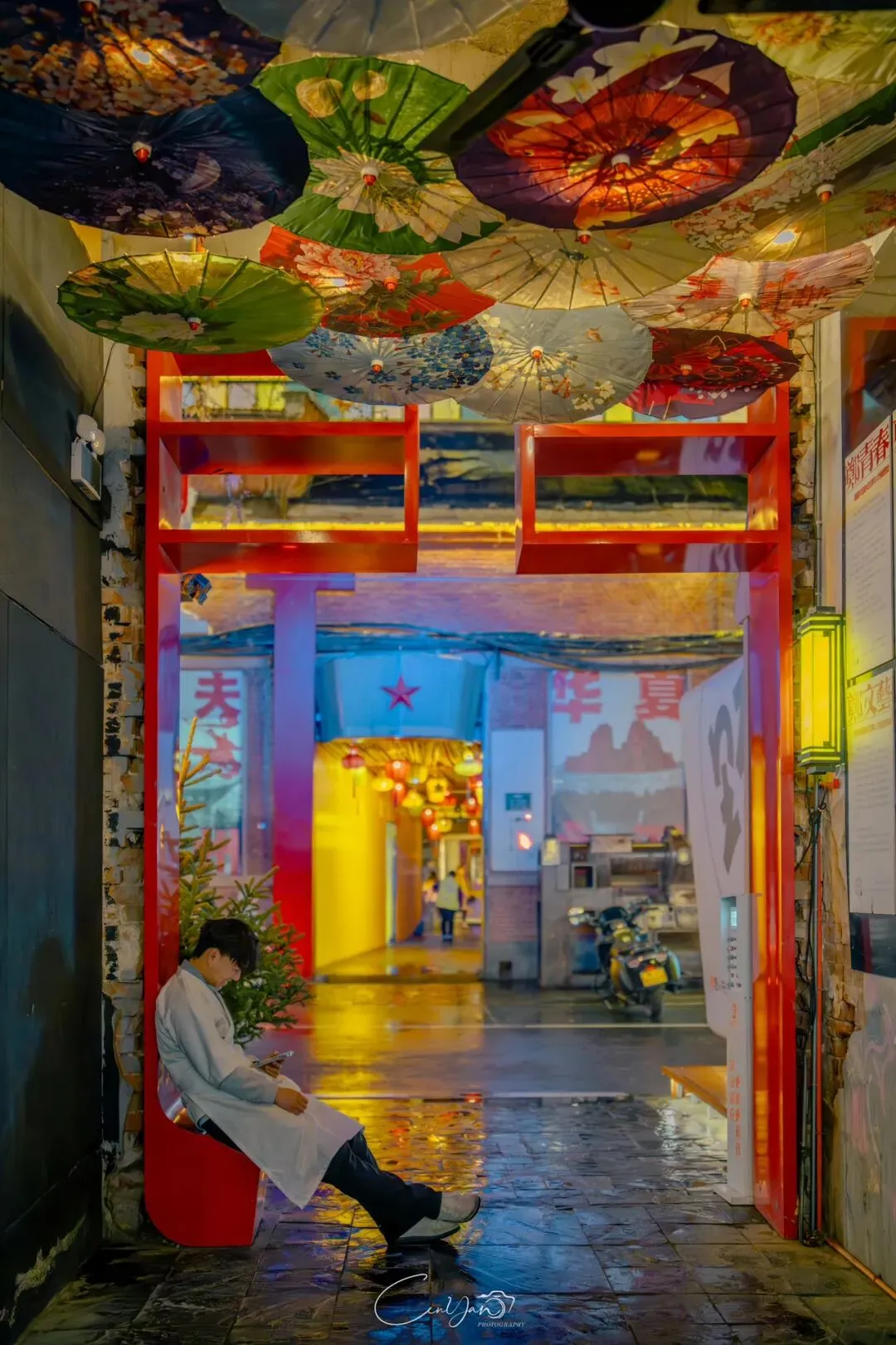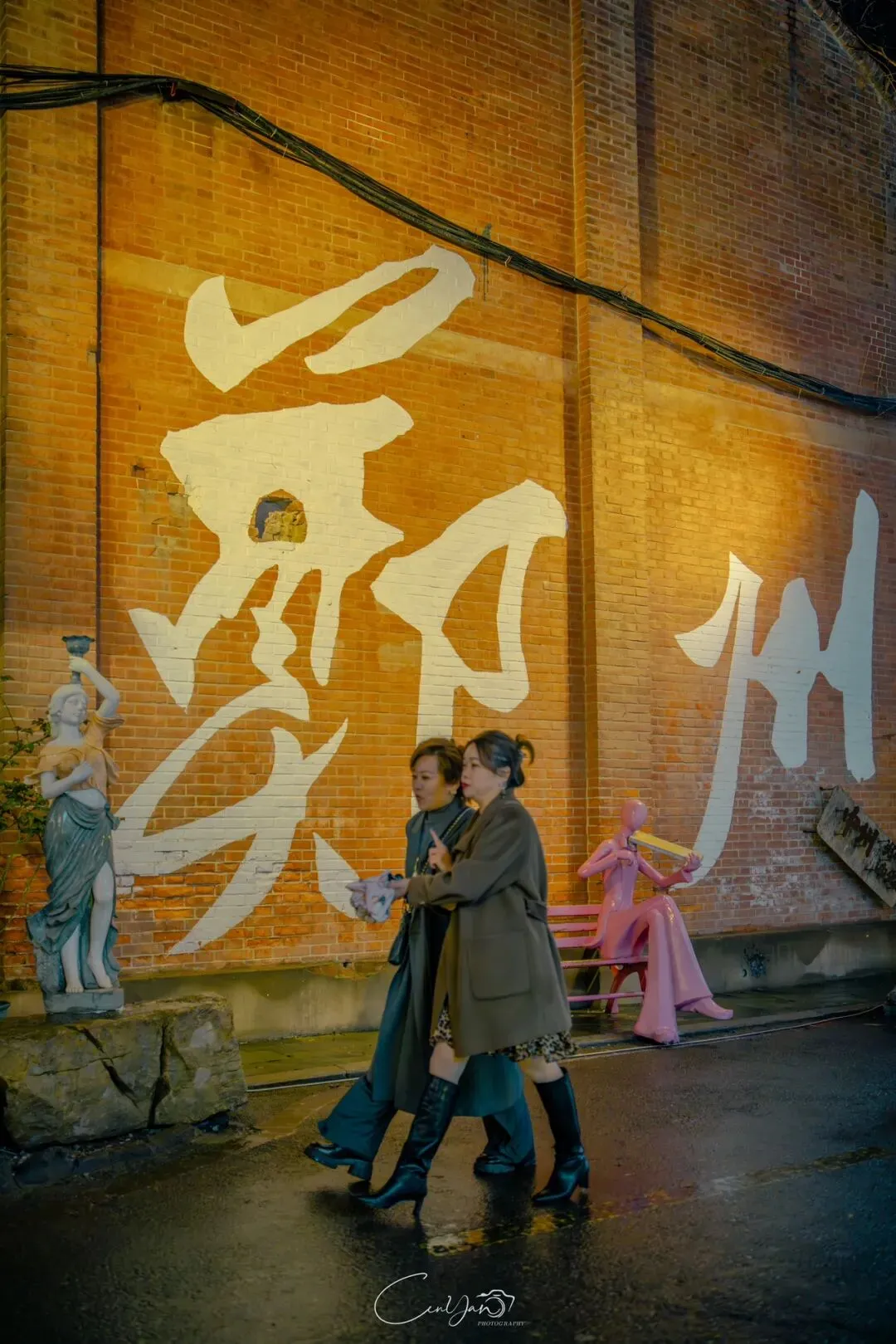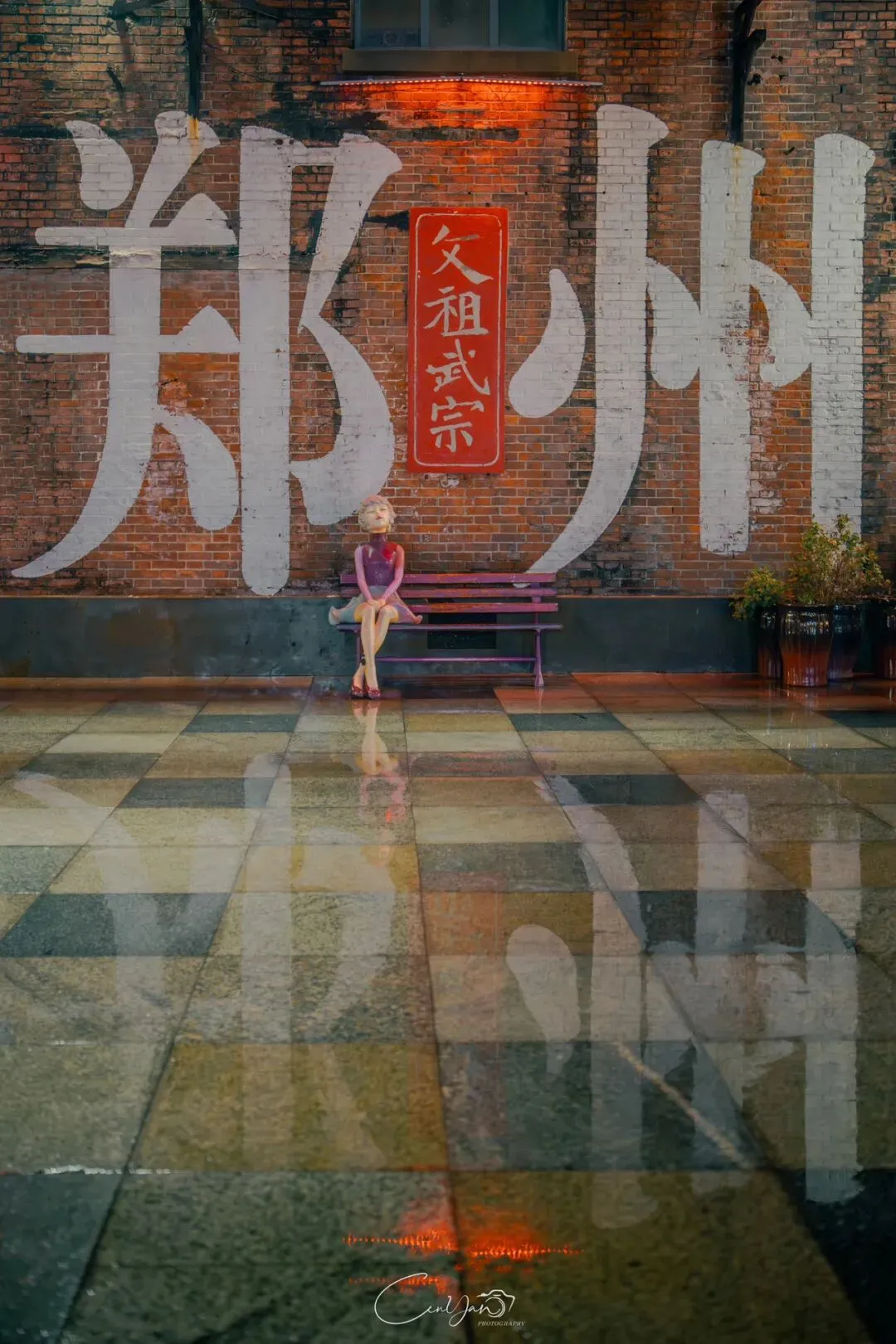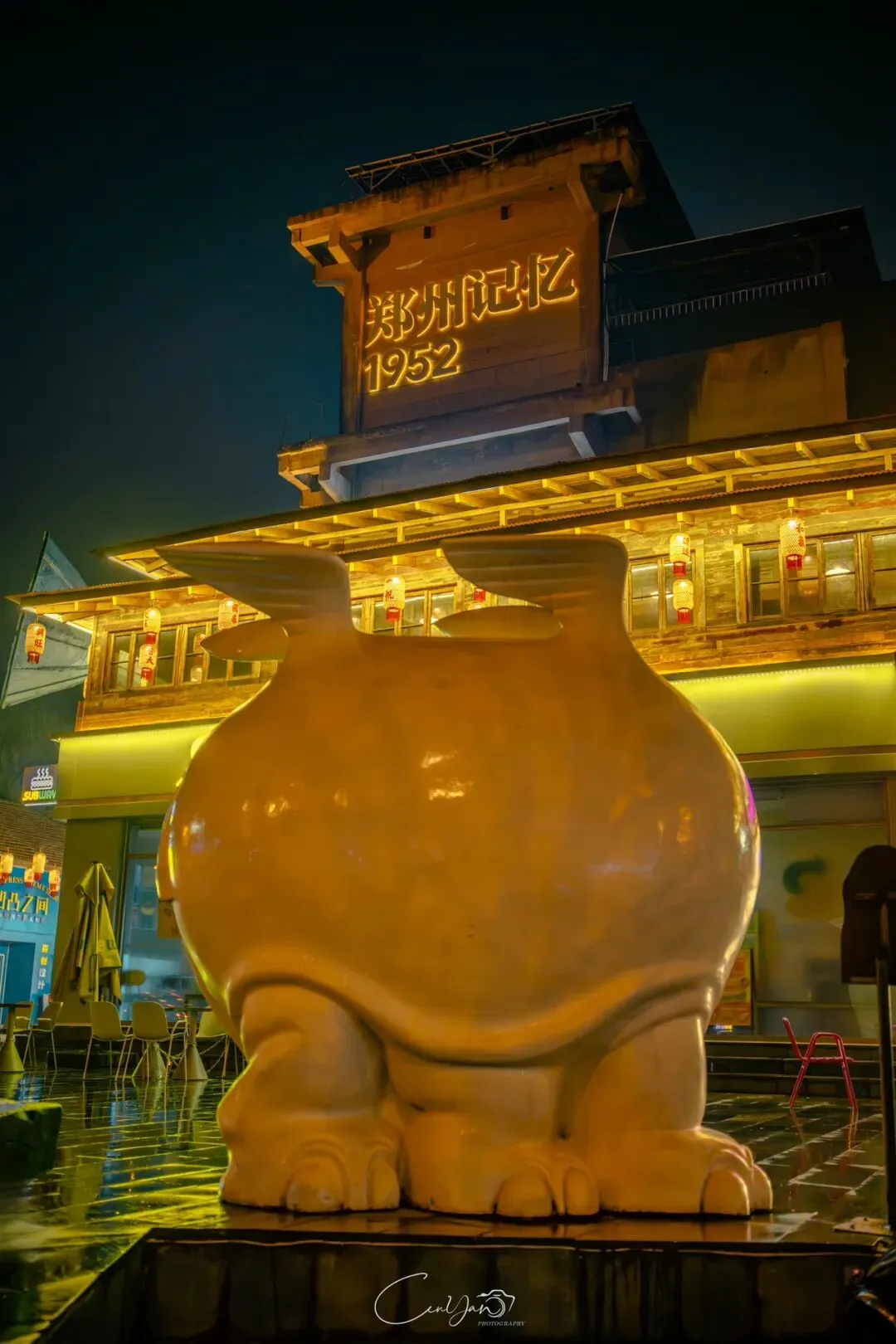 如今,机器声远去,车间变成了店铺,烟囱变成了景观,老厂房被重新点亮,变成了年轻人喜欢的样子。霓虹灯牌亮起,咖啡店、文创店、小酒馆依次开门,雨水把地面洗得发亮,积水成了天然的镜子,把灯牌、屋檐、人影全都倒映出来。我蹲下来,把镜头贴近水面,按下快门的那一刻,画面里一半是现实,一半是虚幻,一半是新潮,一半是沧桑。沿着蜜油巷往里走,暖黄色的灯带勾勒出老郑州的市井轮廓,积水里的倒影将牌坊拉成一条流动的光河。我想起老工人的讲述:曾经的油化厂,车间里飘着棉籽油的清香,工人们穿着工装在流水线旁忙碌,肥皂的泡沫与蒸汽交织成工业时代的浪漫。如今,机器的轰鸣被咖啡馆的音乐取代,斑驳的砖墙被霓虹灯牌点亮,老厂房的筋骨里长出了新的烟火。“久祖武宗”的墙面大字带着江湖气,长椅上的人偶静静坐着,像在倾听70年的岁月回响——从榨棉籽油到生产洗衣膏、肥皂、香皂,从工业基地到创意街区,油化厂的每一块砖,都在诉说着郑州从工业时代到文创时代的蜕变。