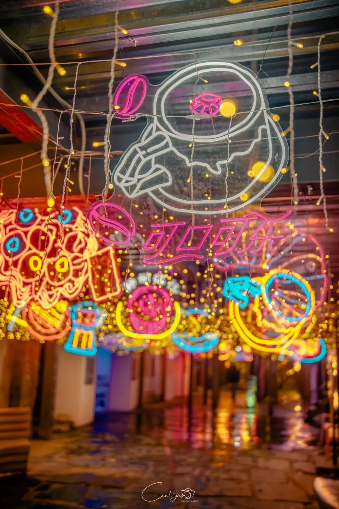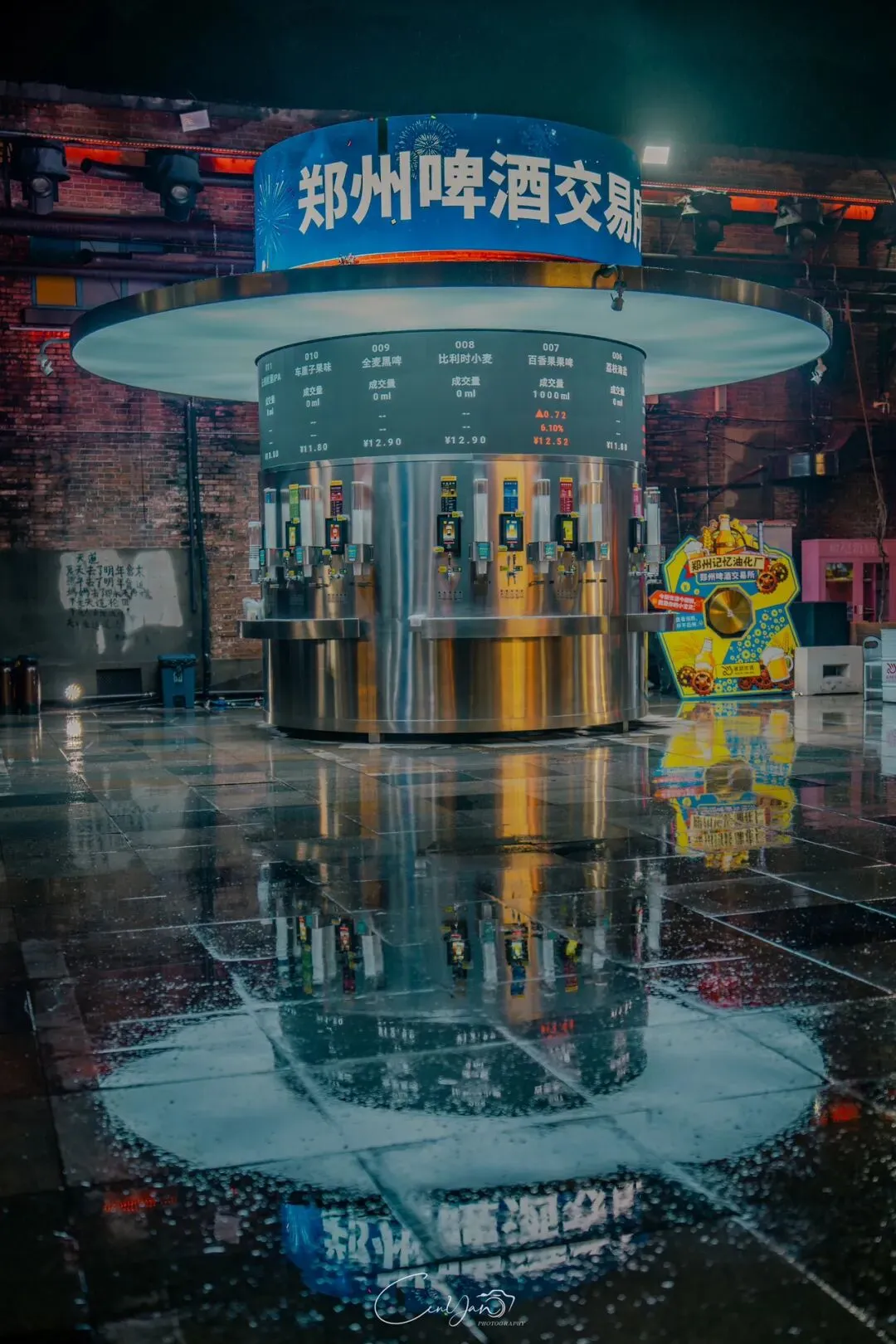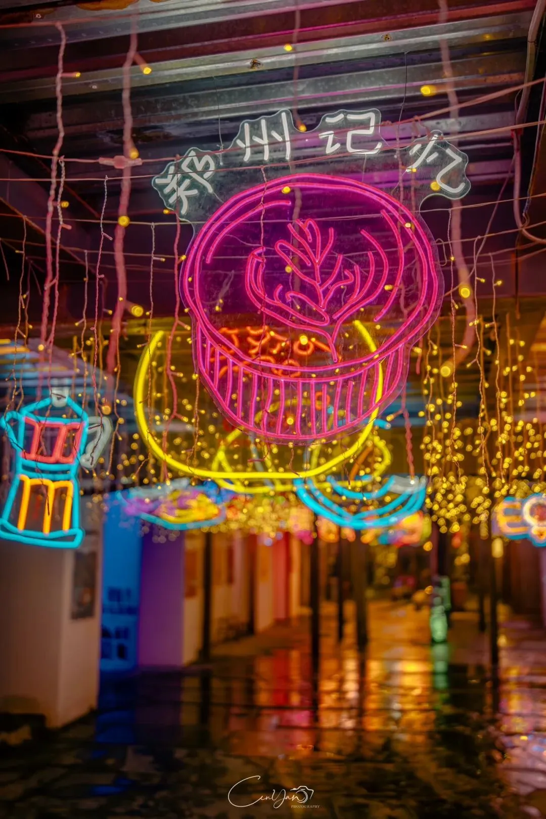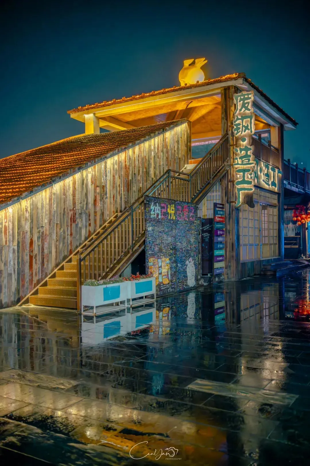 如今,机器声远去,车间变成了店铺,烟囱变成了景观,老厂房被重新点亮,变成了年轻人喜欢的样子。霓虹灯牌亮起,咖啡店、文创店、小酒馆依次开门,雨水把地面洗得发亮,积水成了天然的镜子,把灯牌、屋檐、人影全都倒映出来。我蹲下来,把镜头贴近水面,按下快门的那一刻,画面里一半是现实,一半是虚幻,一半是新潮,一半是沧桑。沿着蜜油巷往里走,暖黄色的灯带勾勒出老郑州的市井轮廓,积水里的倒影将牌坊拉成一条流动的光河。我想起老工人的讲述:曾经的油化厂,车间里飘着棉籽油的清香,工人们穿着工装在流水线旁忙碌,肥皂的泡沫与蒸汽交织成工业时代的浪漫。如今,机器的轰鸣被咖啡馆的音乐取代,斑驳的砖墙被霓虹灯牌点亮,老厂房的筋骨里长出了新的烟火。“久祖武宗”的墙面大字带着江湖气,长椅上的人偶静静坐着,像在倾听70年的岁月回响——从榨棉籽油到生产洗衣膏、肥皂、香皂,从工业基地到创意街区,油化厂的每一块砖,都在诉说着郑州从工业时代到文创时代的蜕变。