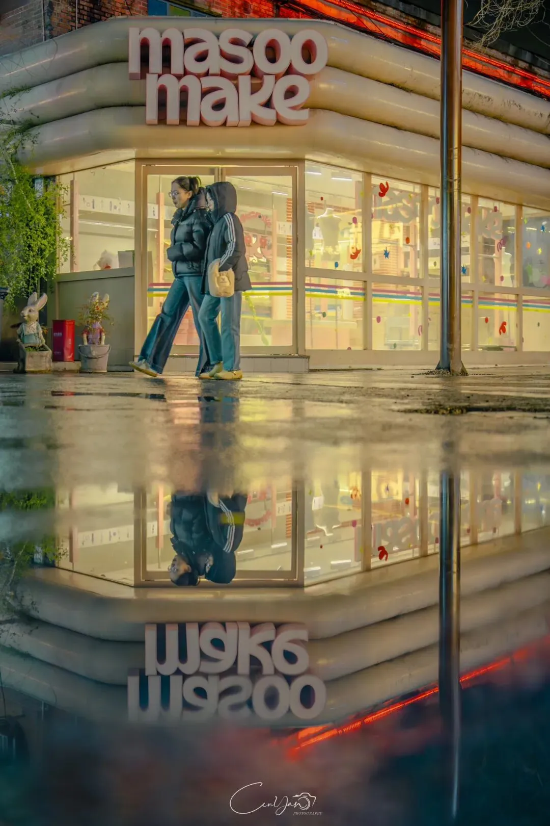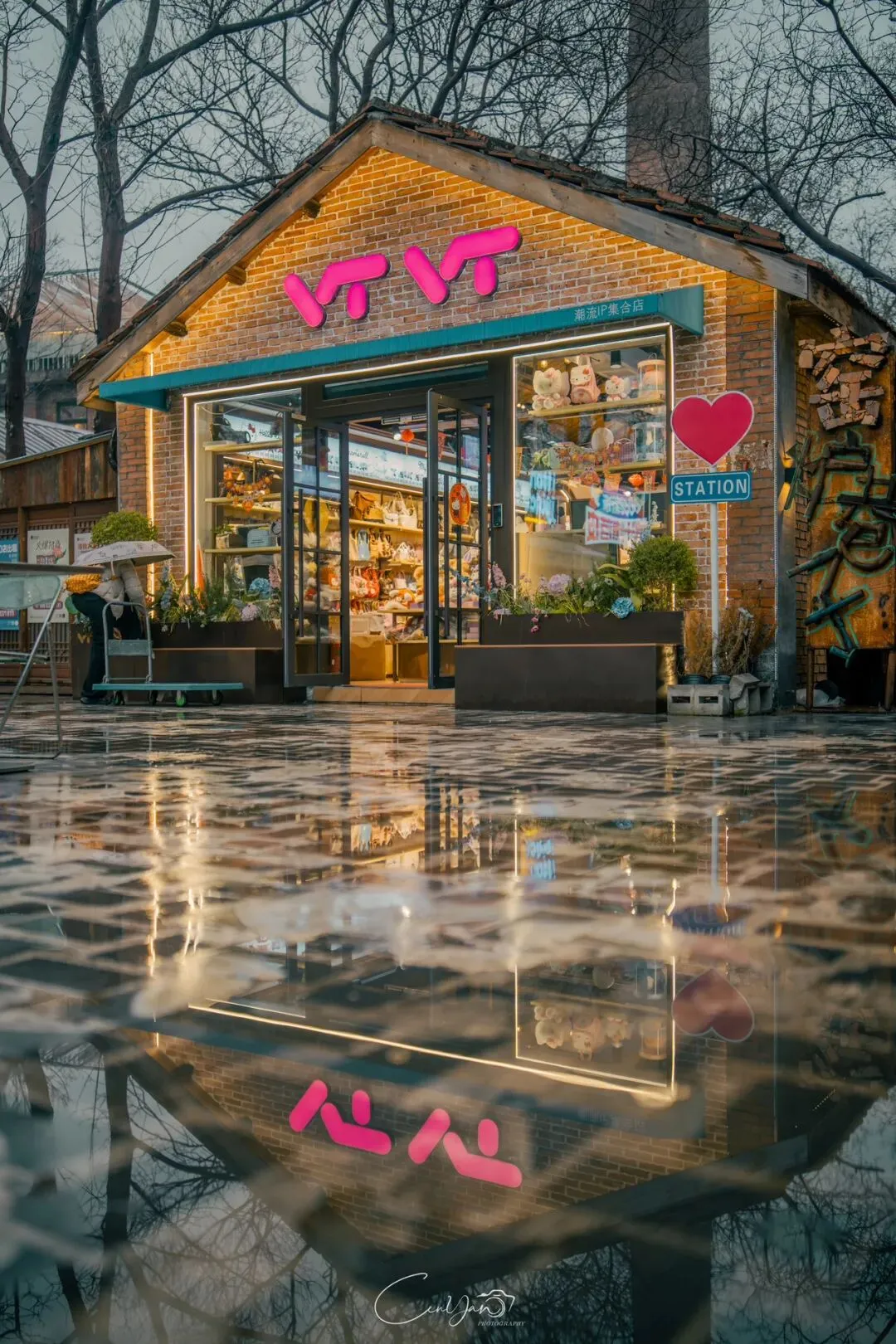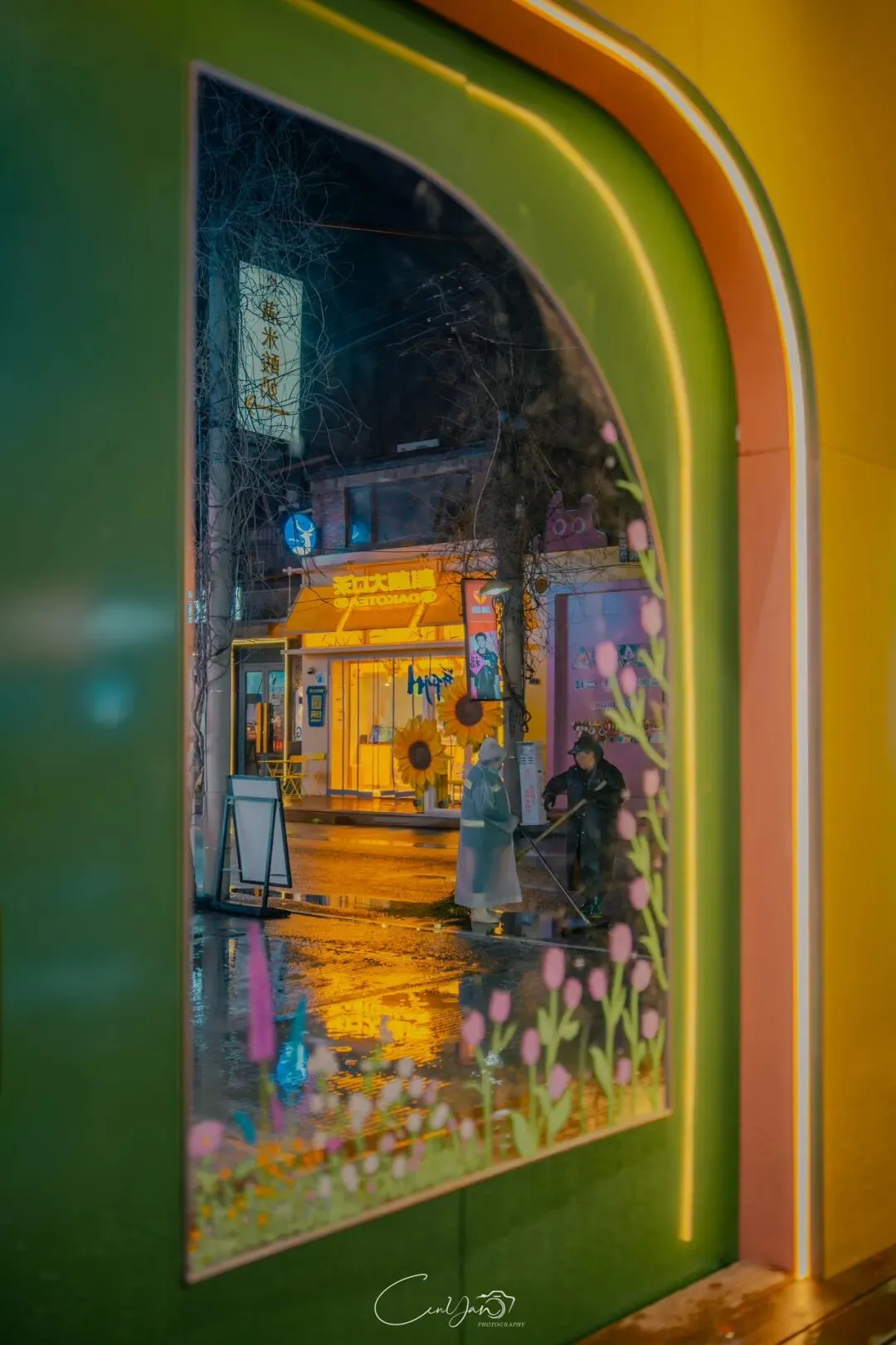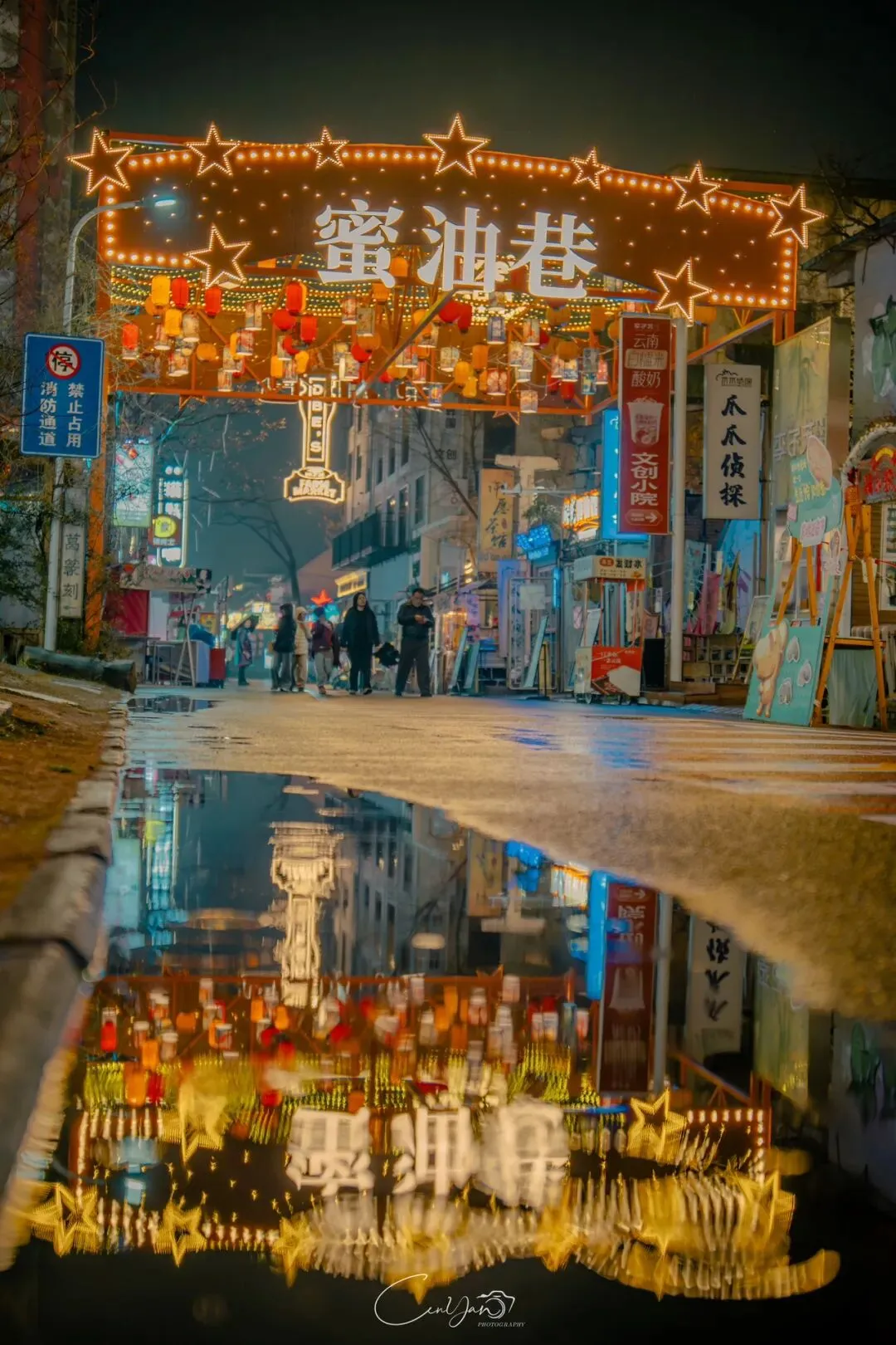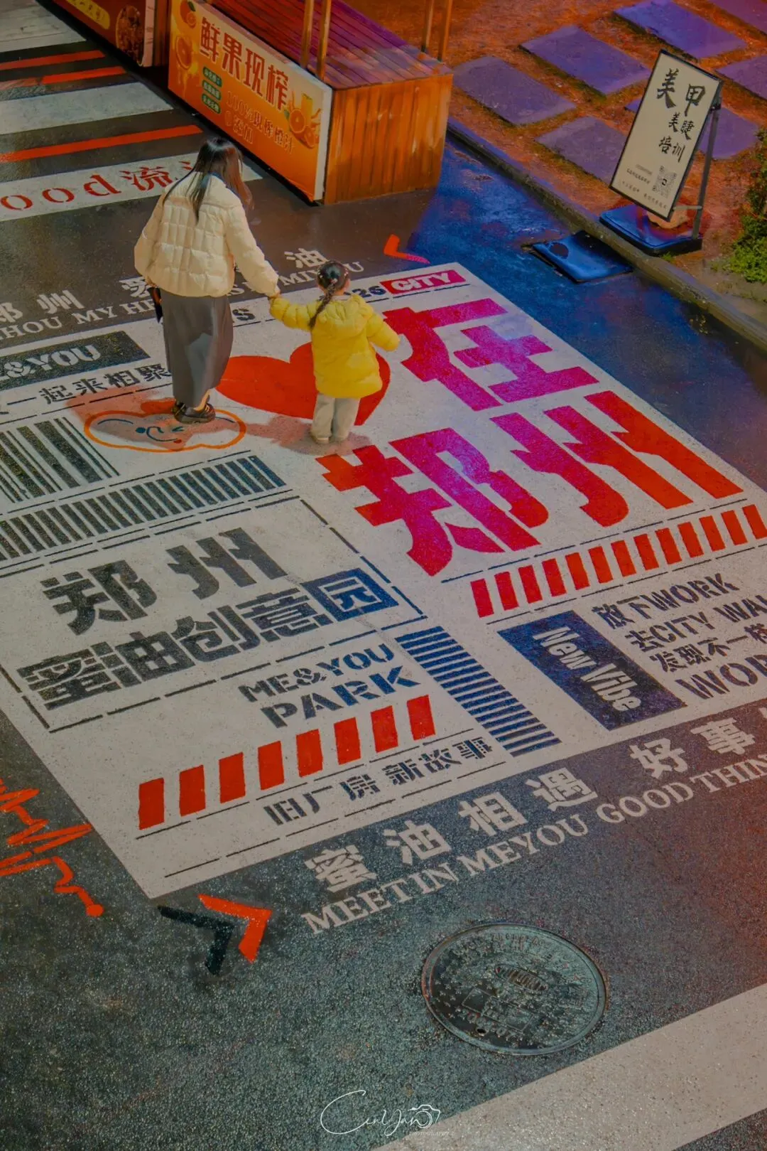 如今,机器声远去,车间变成了店铺,烟囱变成了景观,老厂房被重新点亮,变成了年轻人喜欢的样子。霓虹灯牌亮起,咖啡店、文创店、小酒馆依次开门,雨水把地面洗得发亮,积水成了天然的镜子,把灯牌、屋檐、人影全都倒映出来。我蹲下来,把镜头贴近水面,按下快门的那一刻,画面里一半是现实,一半是虚幻,一半是新潮,一半是沧桑。沿着蜜油巷往里走,暖黄色的灯带勾勒出老郑州的市井轮廓,积水里的倒影将牌坊拉成一条流动的光河。我想起老工人的讲述:曾经的油化厂,车间里飘着棉籽油的清香,工人们穿着工装在流水线旁忙碌,肥皂的泡沫与蒸汽交织成工业时代的浪漫。如今,机器的轰鸣被咖啡馆的音乐取代,斑驳的砖墙被霓虹灯牌点亮,老厂房的筋骨里长出了新的烟火。“久祖武宗”的墙面大字带着江湖气,长椅上的人偶静静坐着,像在倾听70年的岁月回响——从榨棉籽油到生产洗衣膏、肥皂、香皂,从工业基地到创意街区,油化厂的每一块砖,都在诉说着郑州从工业时代到文创时代的蜕变。