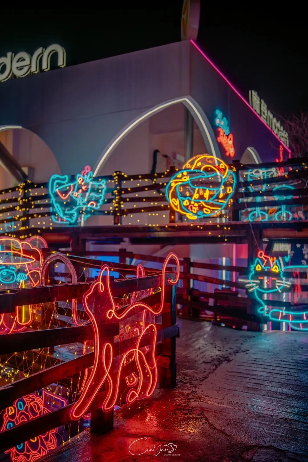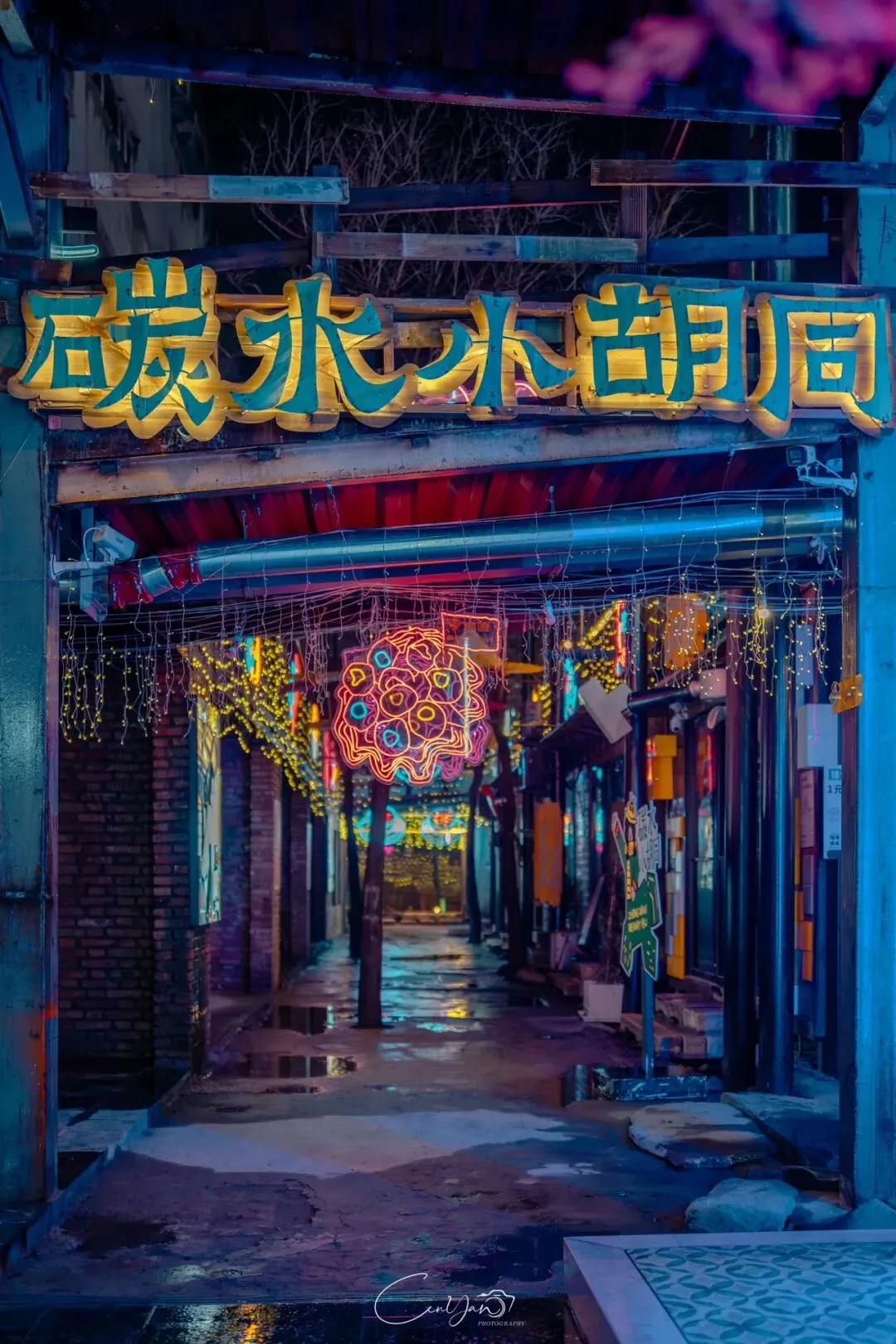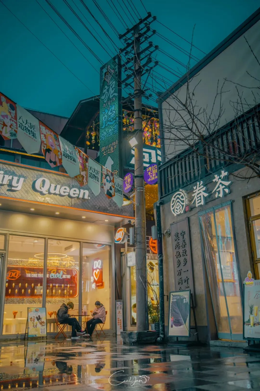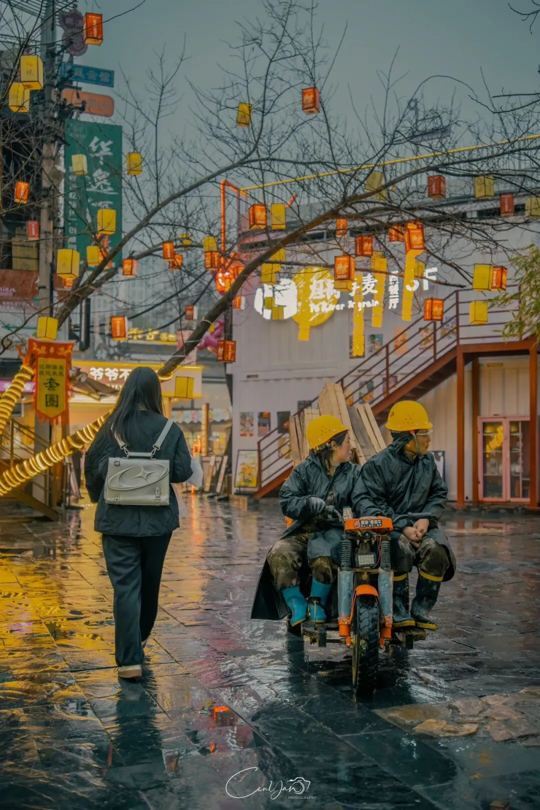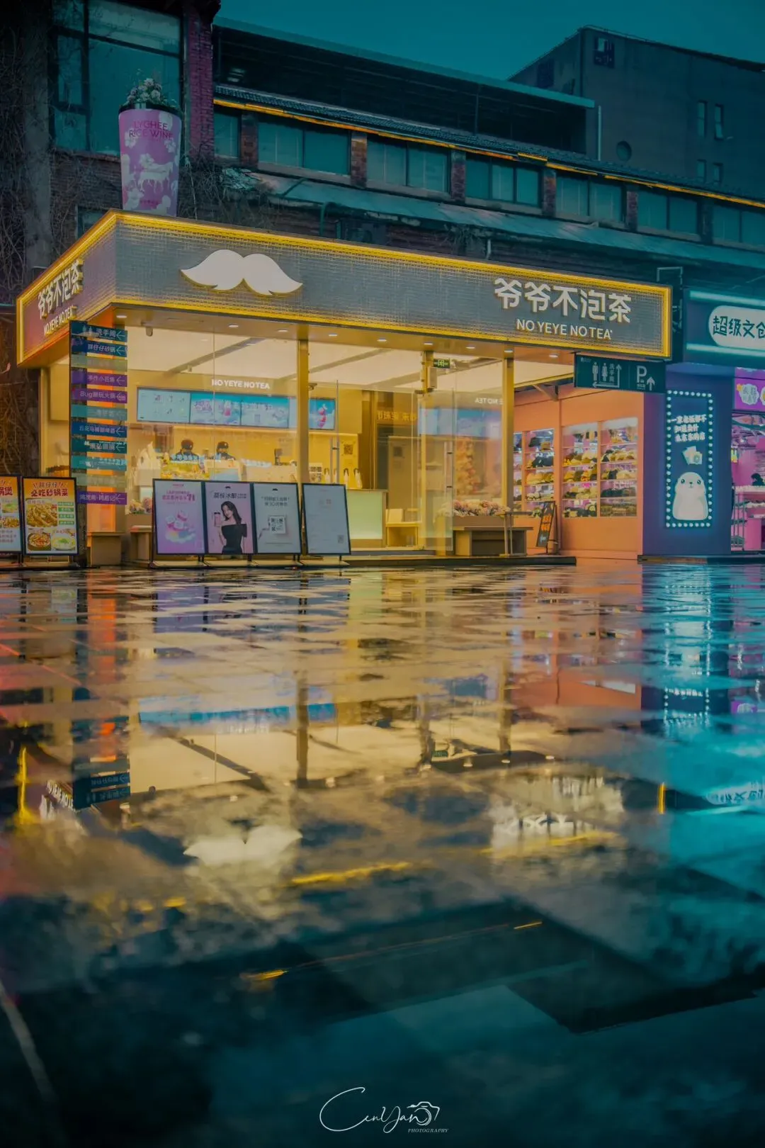 如今,机器声远去,车间变成了店铺,烟囱变成了景观,老厂房被重新点亮,变成了年轻人喜欢的样子。霓虹灯牌亮起,咖啡店、文创店、小酒馆依次开门,雨水把地面洗得发亮,积水成了天然的镜子,把灯牌、屋檐、人影全都倒映出来。我蹲下来,把镜头贴近水面,按下快门的那一刻,画面里一半是现实,一半是虚幻,一半是新潮,一半是沧桑。沿着蜜油巷往里走,暖黄色的灯带勾勒出老郑州的市井轮廓,积水里的倒影将牌坊拉成一条流动的光河。我想起老工人的讲述:曾经的油化厂,车间里飘着棉籽油的清香,工人们穿着工装在流水线旁忙碌,肥皂的泡沫与蒸汽交织成工业时代的浪漫。如今,机器的轰鸣被咖啡馆的音乐取代,斑驳的砖墙被霓虹灯牌点亮,老厂房的筋骨里长出了新的烟火。“久祖武宗”的墙面大字带着江湖气,长椅上的人偶静静坐着,像在倾听70年的岁月回响——从榨棉籽油到生产洗衣膏、肥皂、香皂,从工业基地到创意街区,油化厂的每一块砖,都在诉说着郑州从工业时代到文创时代的蜕变。
