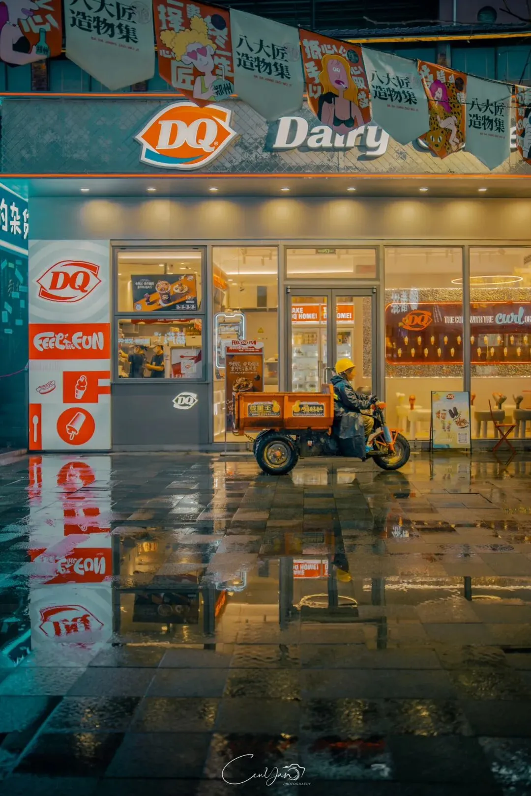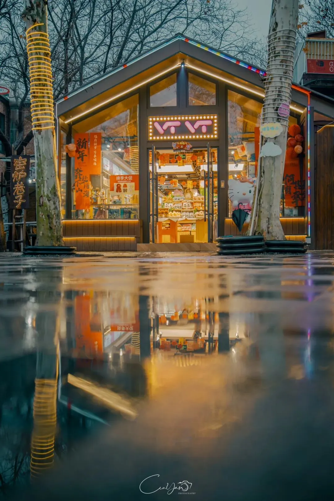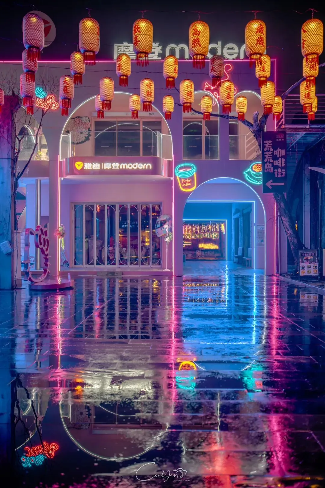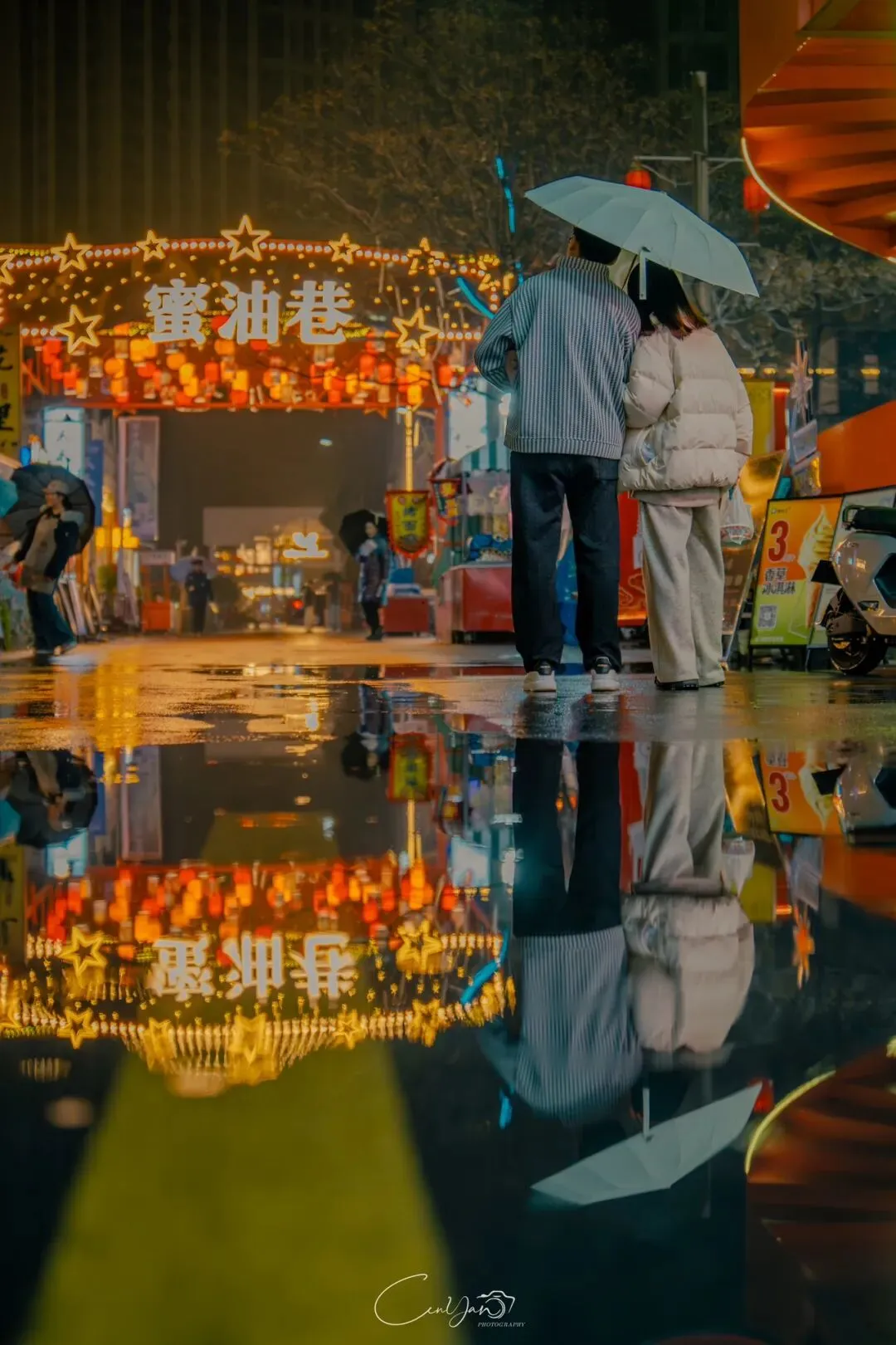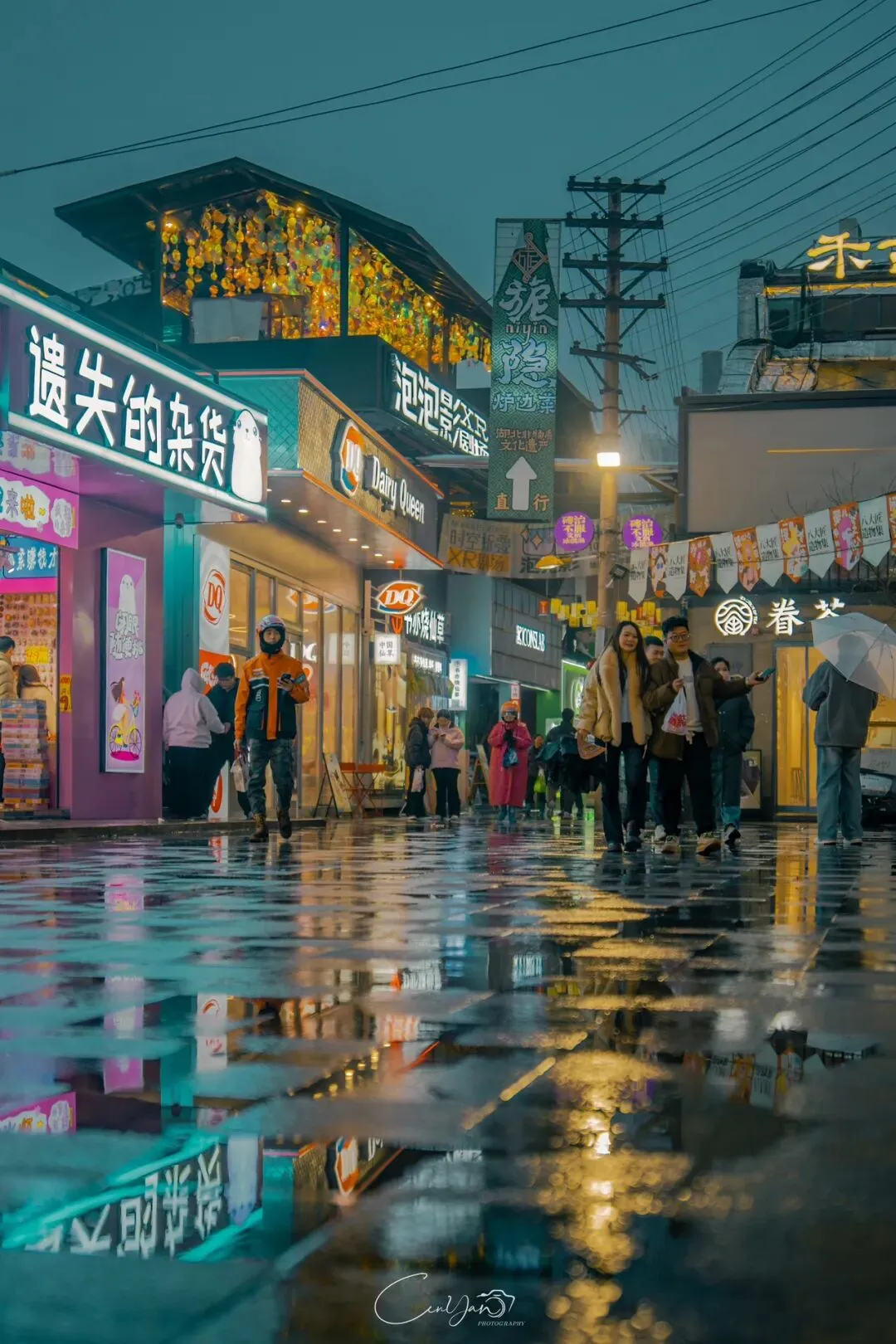 如今,机器声远去,车间变成了店铺,烟囱变成了景观,老厂房被重新点亮,变成了年轻人喜欢的样子。霓虹灯牌亮起,咖啡店、文创店、小酒馆依次开门,雨水把地面洗得发亮,积水成了天然的镜子,把灯牌、屋檐、人影全都倒映出来。我蹲下来,把镜头贴近水面,按下快门的那一刻,画面里一半是现实,一半是虚幻,一半是新潮,一半是沧桑。沿着蜜油巷往里走,暖黄色的灯带勾勒出老郑州的市井轮廓,积水里的倒影将牌坊拉成一条流动的光河。我想起老工人的讲述:曾经的油化厂,车间里飘着棉籽油的清香,工人们穿着工装在流水线旁忙碌,肥皂的泡沫与蒸汽交织成工业时代的浪漫。如今,机器的轰鸣被咖啡馆的音乐取代,斑驳的砖墙被霓虹灯牌点亮,老厂房的筋骨里长出了新的烟火。“久祖武宗”的墙面大字带着江湖气,长椅上的人偶静静坐着,像在倾听70年的岁月回响——从榨棉籽油到生产洗衣膏、肥皂、香皂,从工业基地到创意街区,油化厂的每一块砖,都在诉说着郑州从工业时代到文创时代的蜕变。