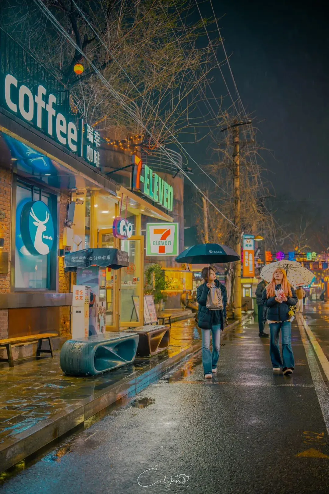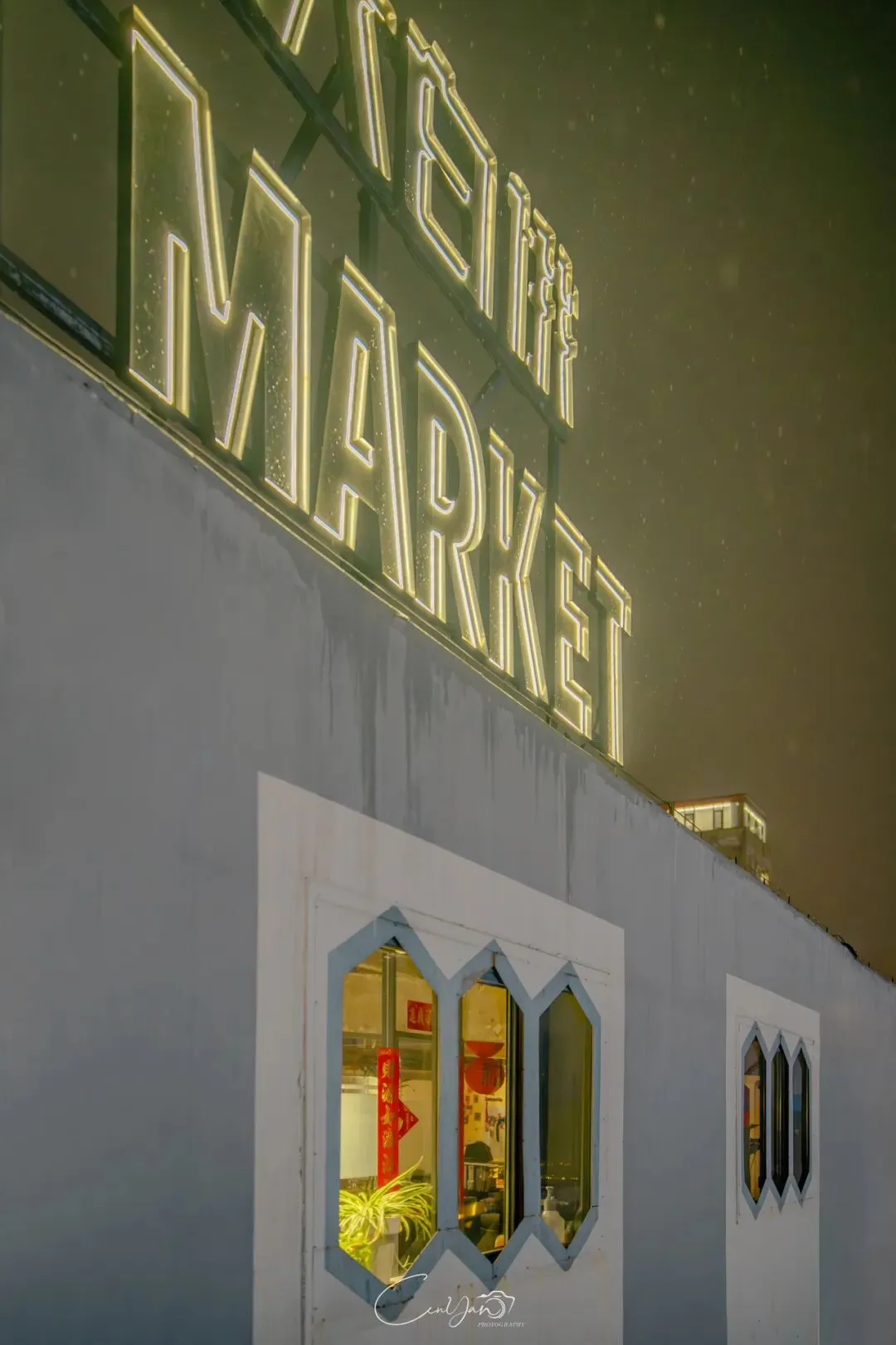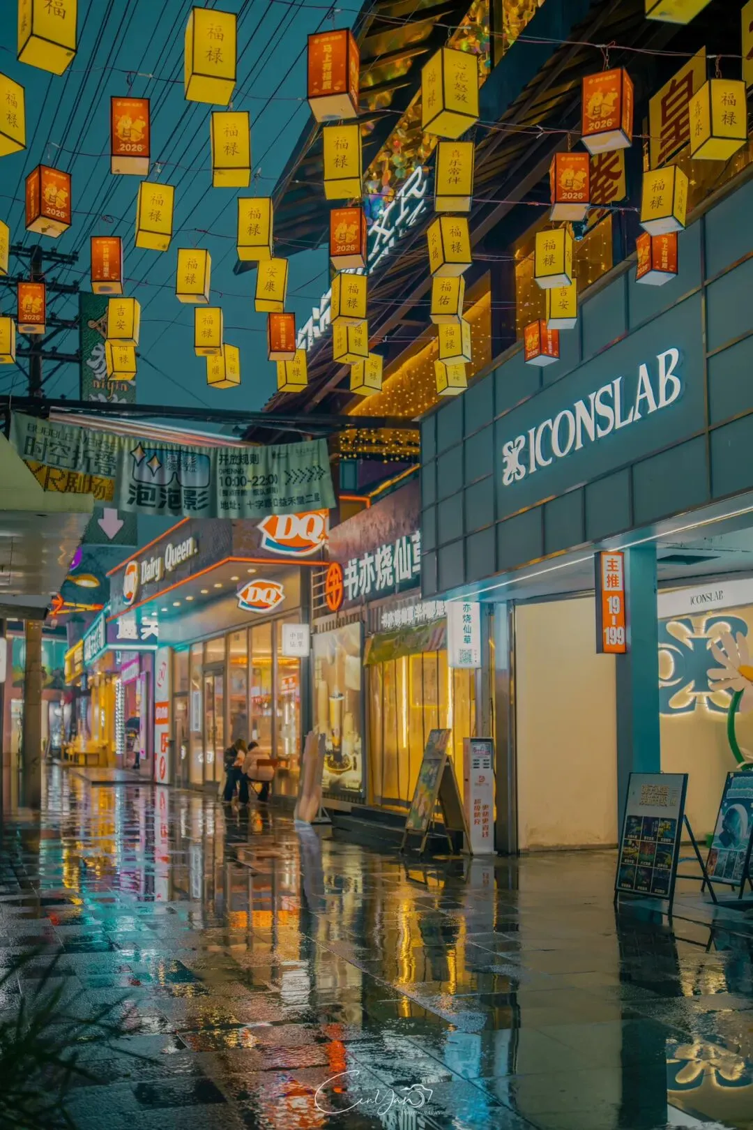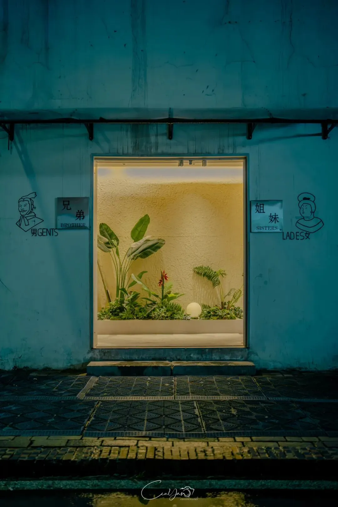 如今,机器声远去,车间变成了店铺,烟囱变成了景观,老厂房被重新点亮,变成了年轻人喜欢的样子。霓虹灯牌亮起,咖啡店、文创店、小酒馆依次开门,雨水把地面洗得发亮,积水成了天然的镜子,把灯牌、屋檐、人影全都倒映出来。我蹲下来,把镜头贴近水面,按下快门的那一刻,画面里一半是现实,一半是虚幻,一半是新潮,一半是沧桑。沿着蜜油巷往里走,暖黄色的灯带勾勒出老郑州的市井轮廓,积水里的倒影将牌坊拉成一条流动的光河。我想起老工人的讲述:曾经的油化厂,车间里飘着棉籽油的清香,工人们穿着工装在流水线旁忙碌,肥皂的泡沫与蒸汽交织成工业时代的浪漫。如今,机器的轰鸣被咖啡馆的音乐取代,斑驳的砖墙被霓虹灯牌点亮,老厂房的筋骨里长出了新的烟火。“久祖武宗”的墙面大字带着江湖气,长椅上的人偶静静坐着,像在倾听70年的岁月回响——从榨棉籽油到生产洗衣膏、肥皂、香皂,从工业基地到创意街区,油化厂的每一块砖,都在诉说着郑州从工业时代到文创时代的蜕变。