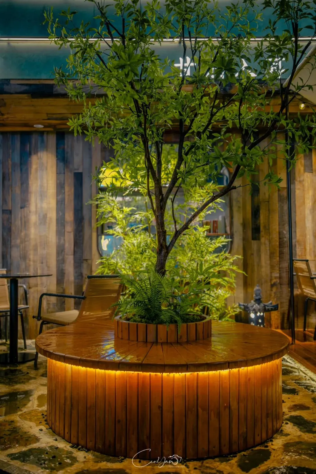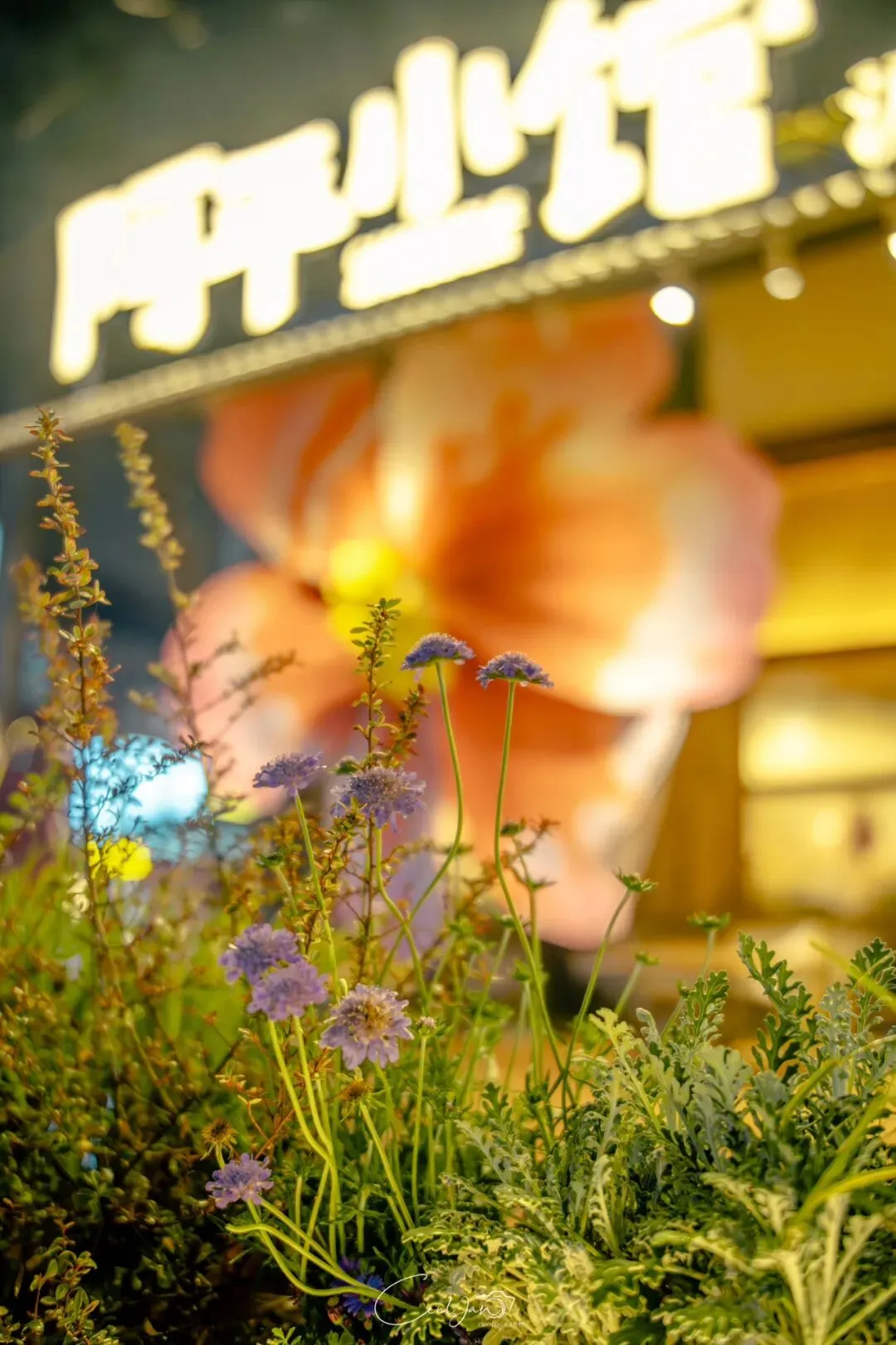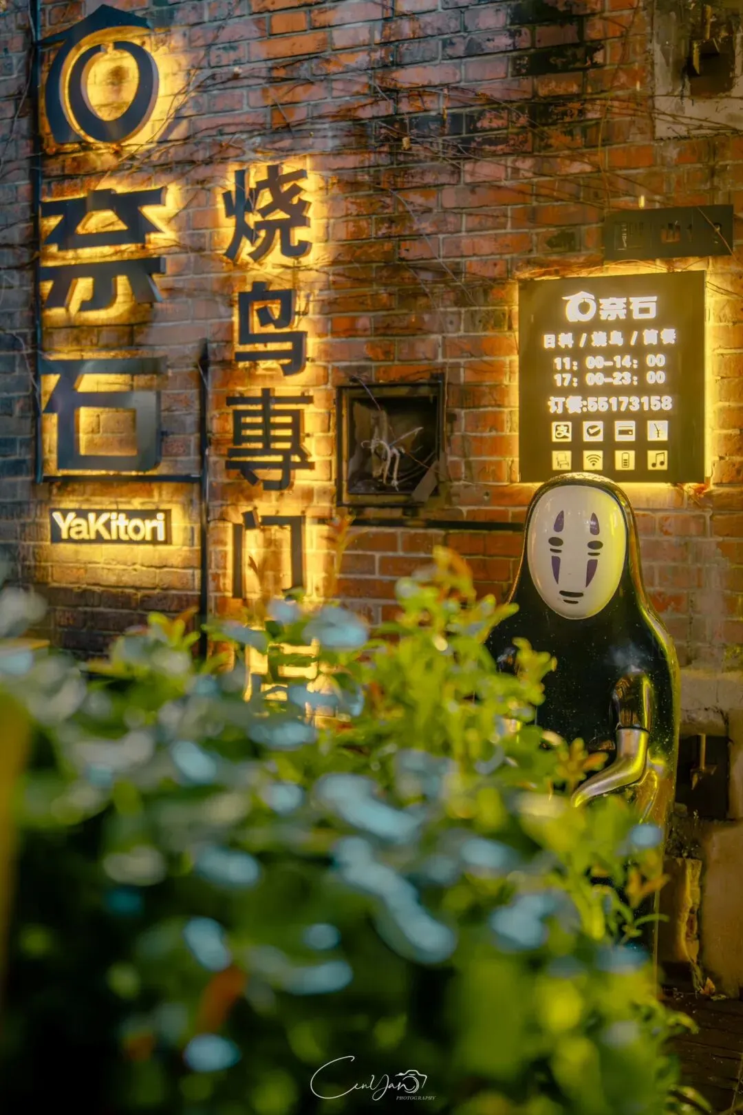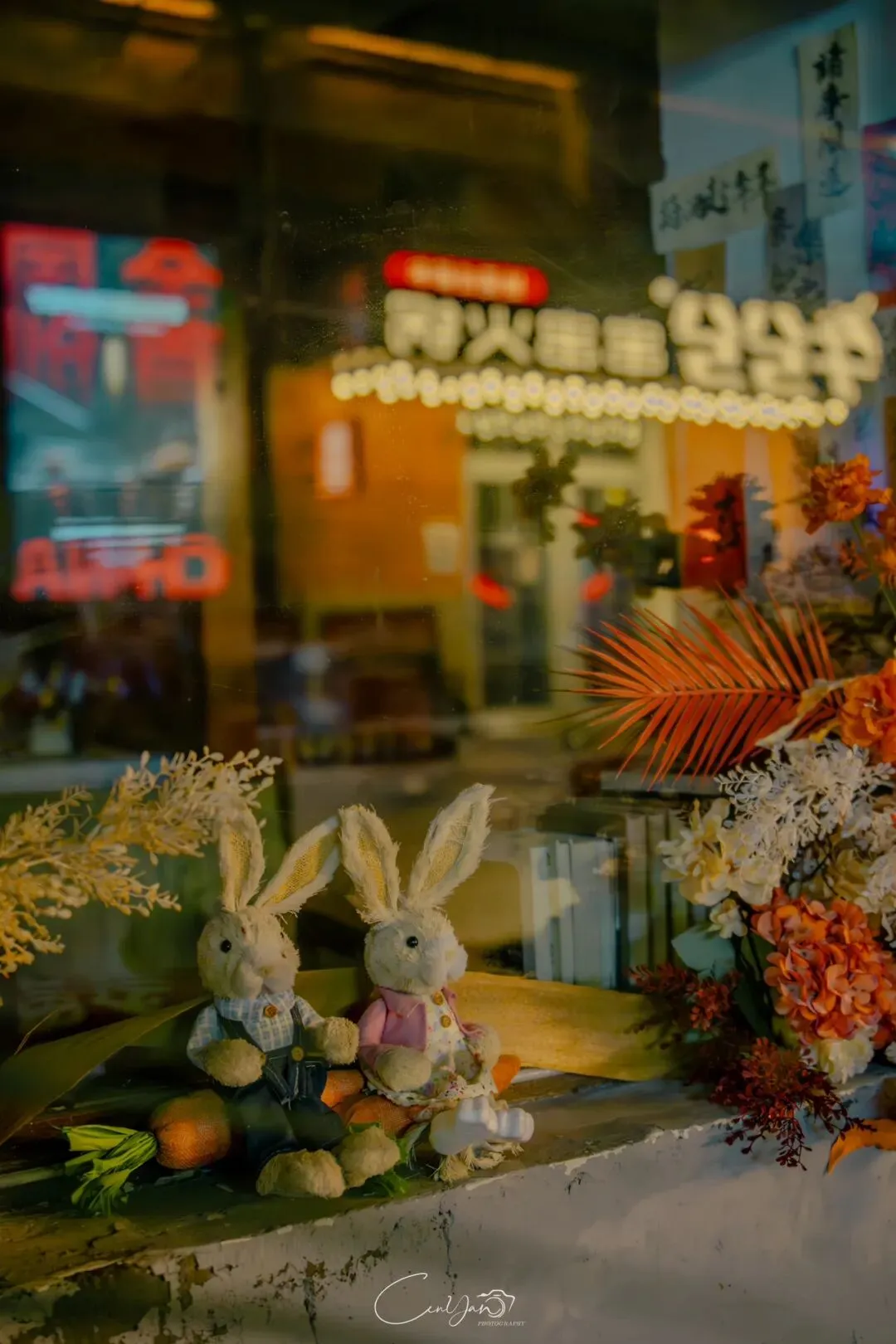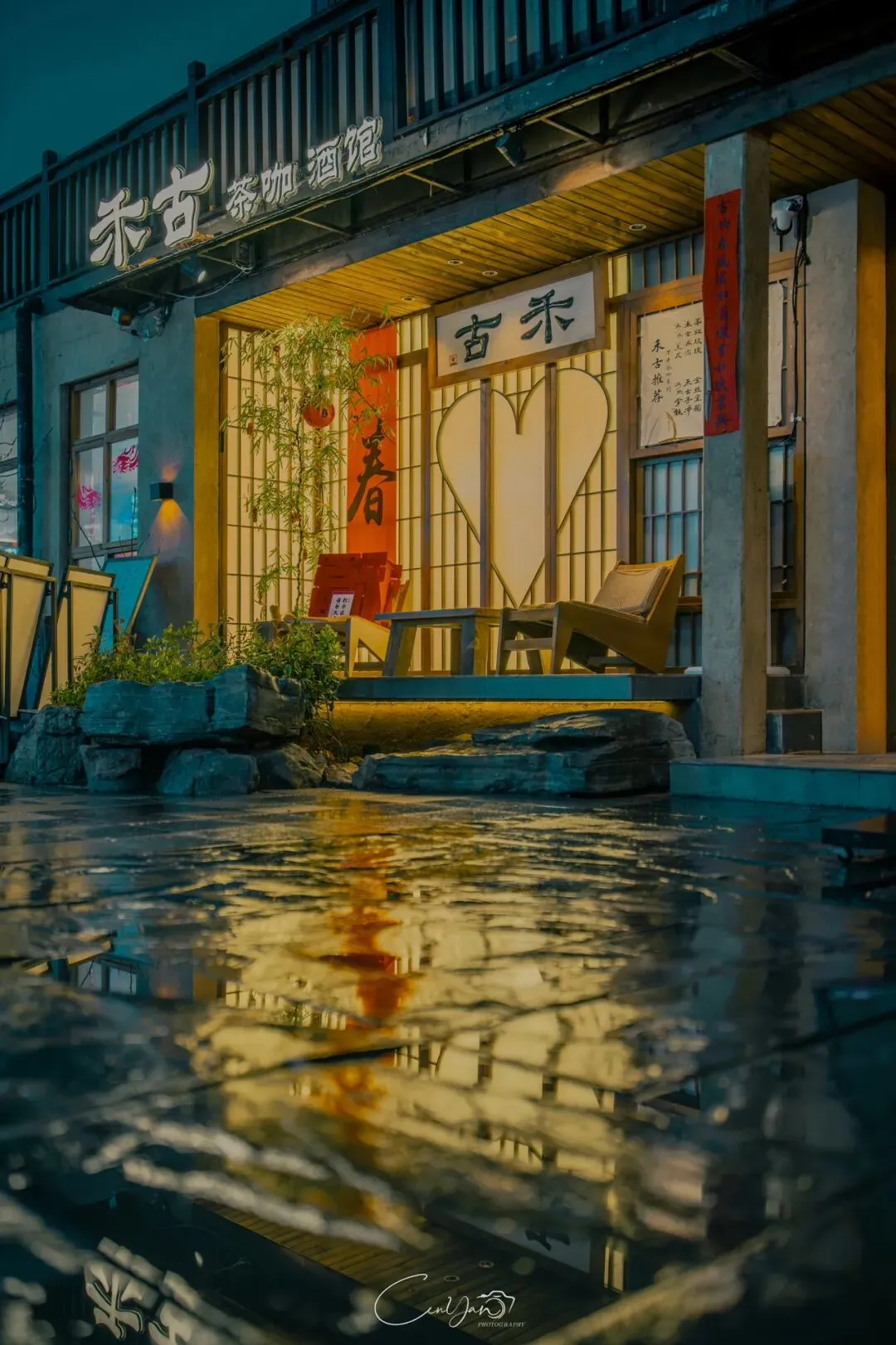如今,机器声远去,车间变成了店铺,烟囱变成了景观,老厂房被重新点亮,变成了年轻人喜欢的样子。霓虹灯牌亮起,咖啡店、文创店、小酒馆依次开门,雨水把地面洗得发亮,积水成了天然的镜子,把灯牌、屋檐、人影全都倒映出来。我蹲下来,把镜头贴近水面,按下快门的那一刻,画面里一半是现实,一半是虚幻,一半是新潮,一半是沧桑。沿着蜜油巷往里走,暖黄色的灯带勾勒出老郑州的市井轮廓,积水里的倒影将牌坊拉成一条流动的光河。我想起老工人的讲述:曾经的油化厂,车间里飘着棉籽油的清香,工人们穿着工装在流水线旁忙碌,肥皂的泡沫与蒸汽交织成工业时代的浪漫。如今,机器的轰鸣被咖啡馆的音乐取代,斑驳的砖墙被霓虹灯牌点亮,老厂房的筋骨里长出了新的烟火。“久祖武宗”的墙面大字带着江湖气,长椅上的人偶静静坐着,像在倾听70年的岁月回响——从榨棉籽油到生产洗衣膏、肥皂、香皂,从工业基地到创意街区,油化厂的每一块砖,都在诉说着郑州从工业时代到文创时代的蜕变。
