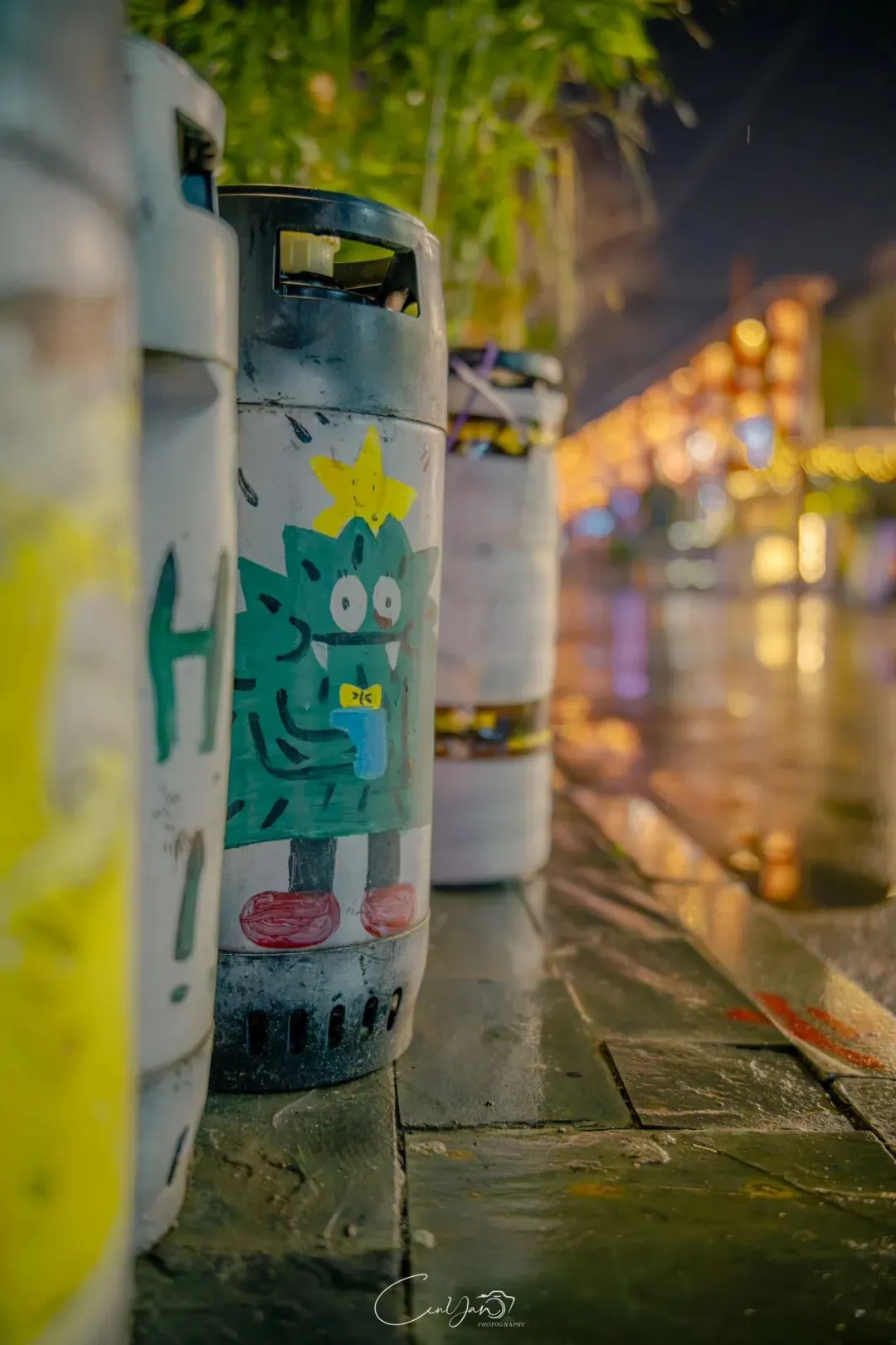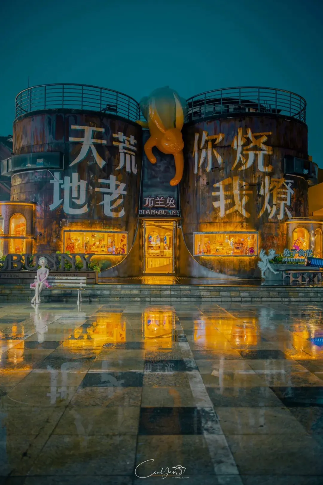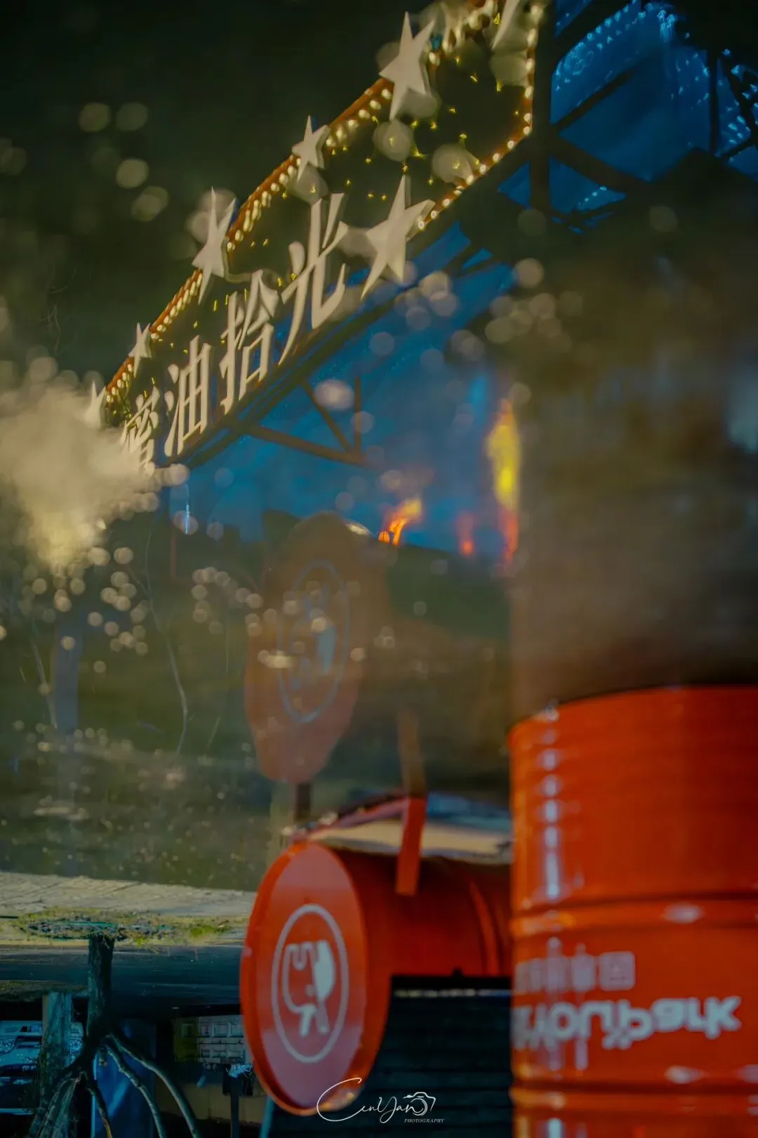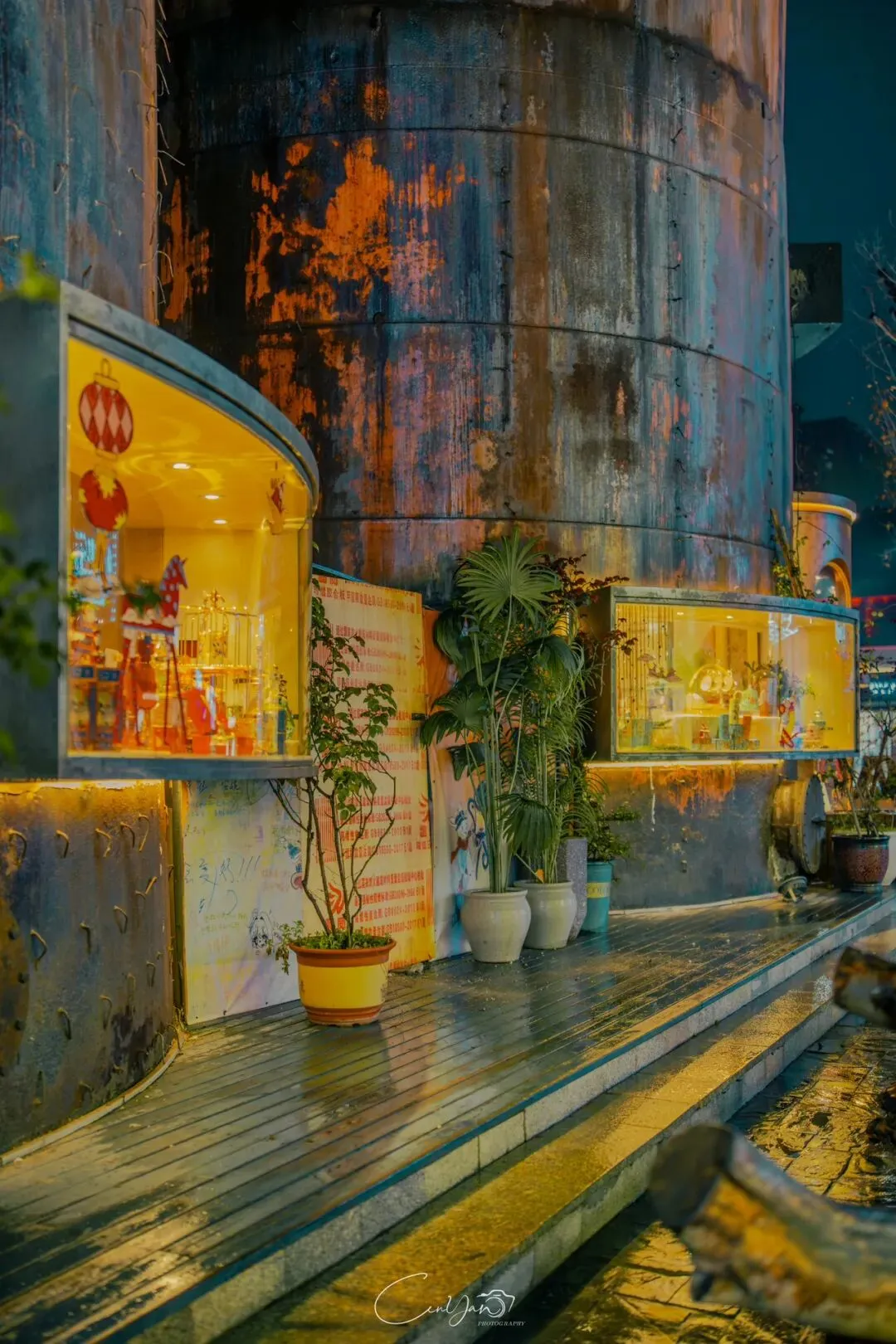 我拍了很多张照片,有霓虹闪烁的街巷,有倒影成双的牌坊,有安静伫立的老罐体,也有被雨水打湿的温暖灯箱。每一张里,都有雨,有光,有水,也有我对这座城市藏不住的喜欢。雨天的油化厂,是最适合触摸历史的时刻。雨水洗去了白日的浮躁,让老厂房的砖墙泛出深沉的光泽,也让霓虹的光影在积水里变得柔软。我站在“天荒地老”的罐体前,看着锈迹斑斑的金属在雨夜里泛着冷光,积水里的倒影将“你烧我燎”的浪漫加倍。曾经,这里是储存油脂的罐体,如今成了年轻人打卡的网红地标;曾经,这里的工人用双手制造生活的必需品,如今,这里的创作者用镜头与文字唤醒城市的记忆。这种新旧交织的张力,正是油化厂最动人的地方——它没有抹去过去,而是让历史与当下在雨夜的光影里达成和解。