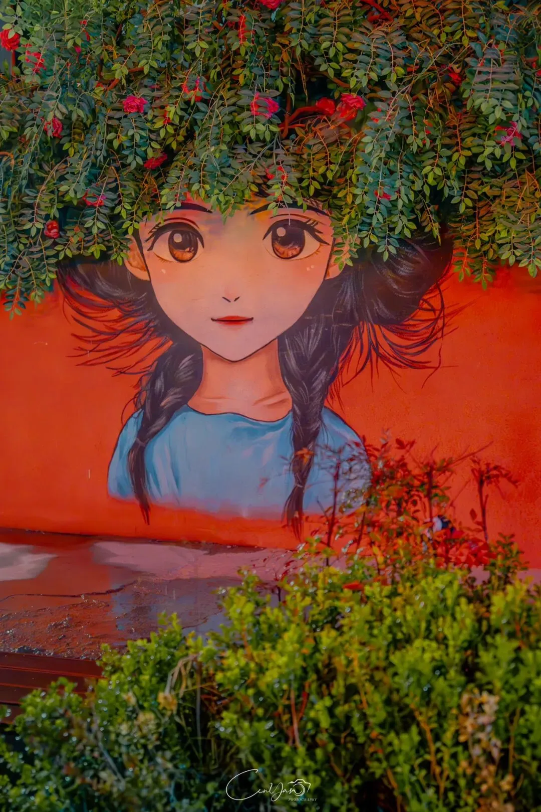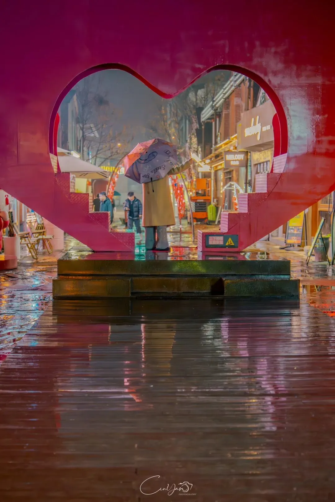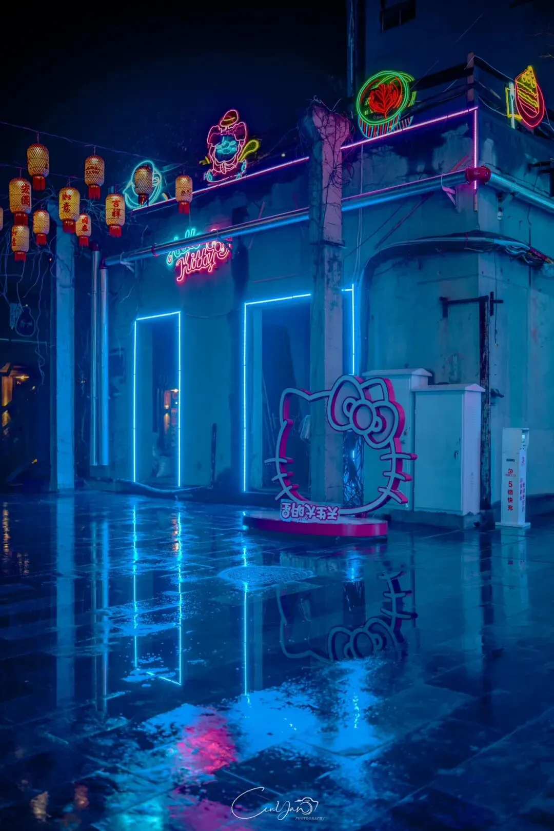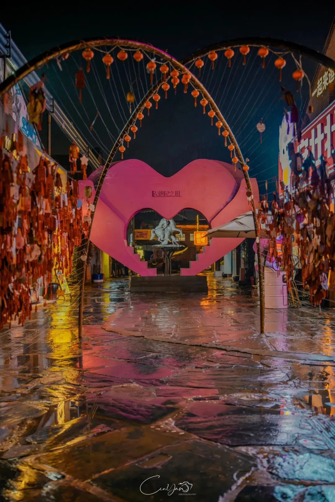我拍了很多张照片,有霓虹闪烁的街巷,有倒影成双的牌坊,有安静伫立的老罐体,也有被雨水打湿的温暖灯箱。每一张里,都有雨,有光,有水,也有我对这座城市藏不住的喜欢。雨天的油化厂,是最适合触摸历史的时刻。雨水洗去了白日的浮躁,让老厂房的砖墙泛出深沉的光泽,也让霓虹的光影在积水里变得柔软。我站在“天荒地老”的罐体前,看着锈迹斑斑的金属在雨夜里泛着冷光,积水里的倒影将“你烧我燎”的浪漫加倍。曾经,这里是储存油脂的罐体,如今成了年轻人打卡的网红地标;曾经,这里的工人用双手制造生活的必需品,如今,这里的创作者用镜头与文字唤醒城市的记忆。这种新旧交织的张力,正是油化厂最动人的地方——它没有抹去过去,而是让历史与当下在雨夜的光影里达成和解。
