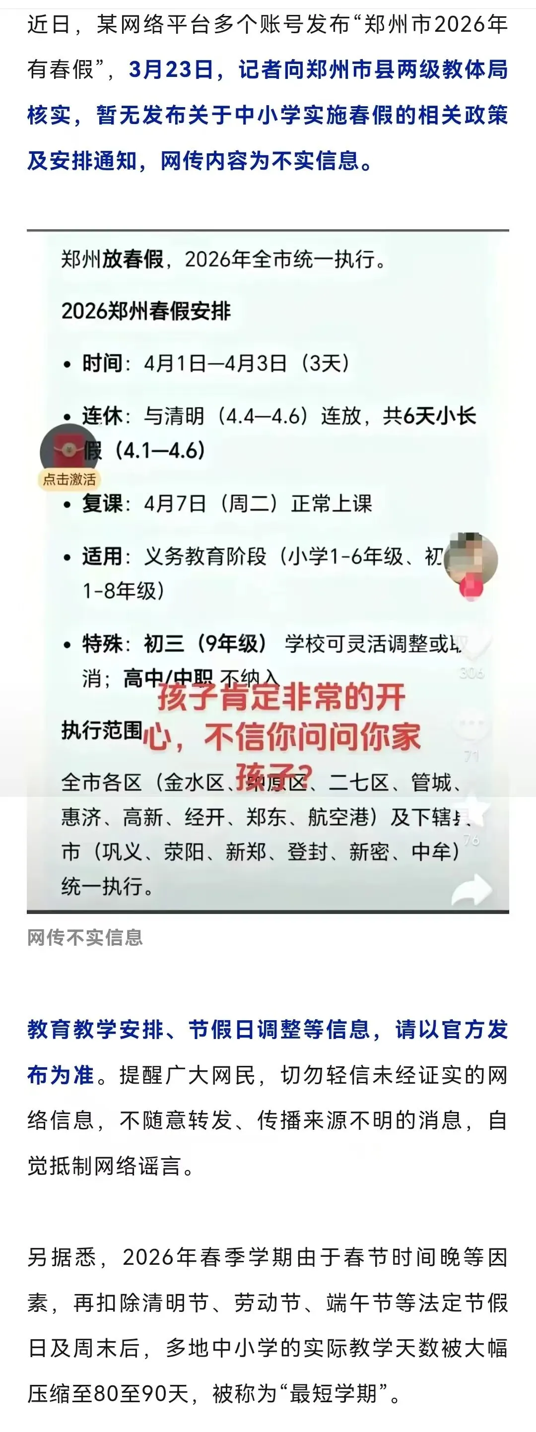 【防骗宣传】事关“郑州中小学春假”,官方发声