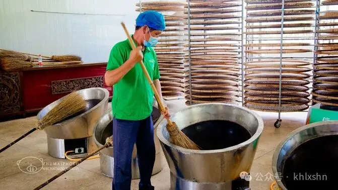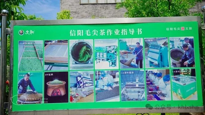 直接往生产车间去,学习学习炒茶哦。园区里张贴有“信阳毛尖茶作业指导书”,标准化了生产流程。