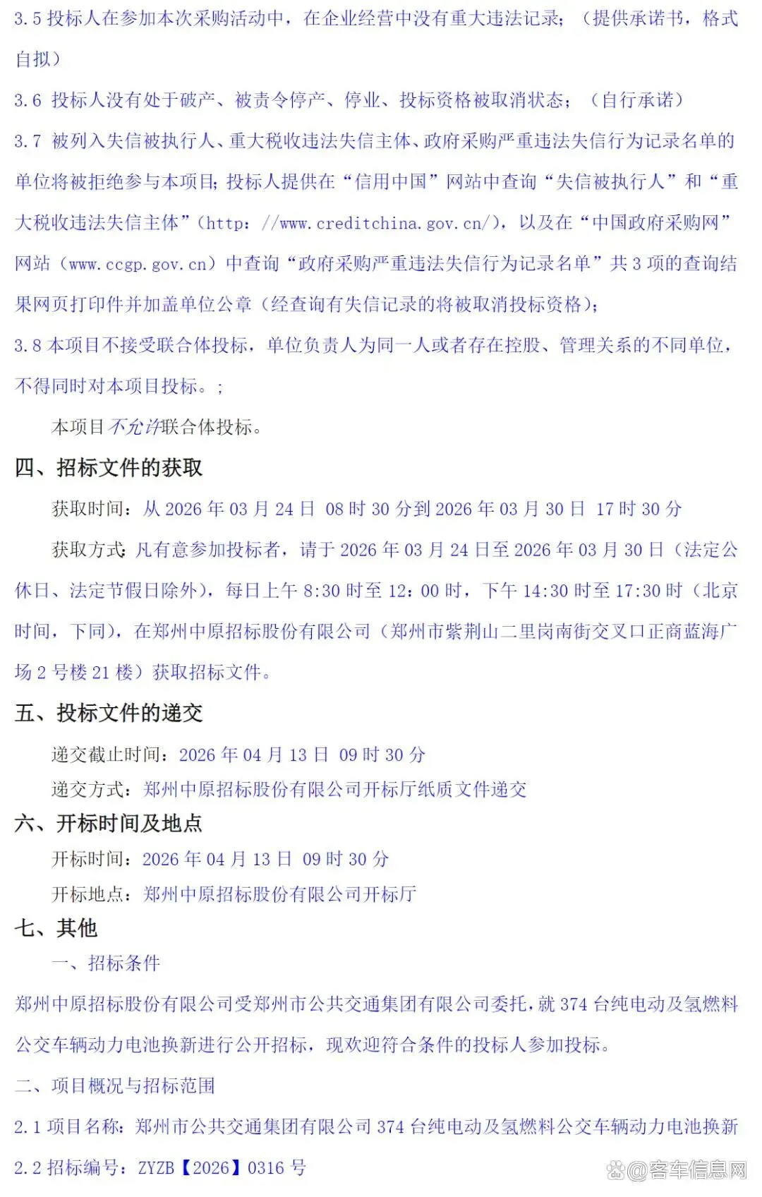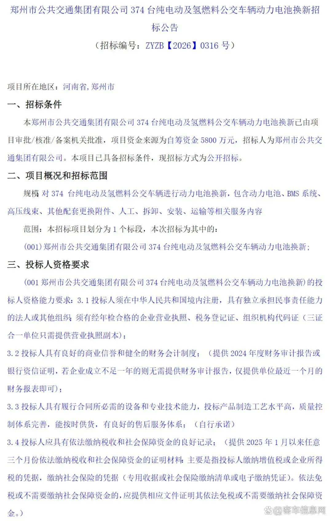 河南省郑州市公共交通集团有限公司374辆纯电动及氢燃料公交车辆动力电池换新招标公告