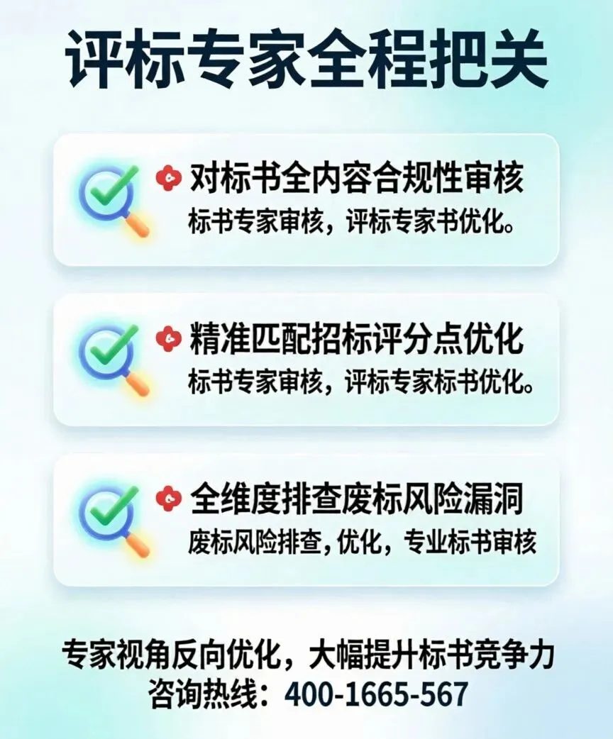 三级核标风控机制全维度优化从初稿编写、方案优化到评分项响应终审,三个环节专人专项把关由熟悉本地评审规则的前评标专家做最终审核全面优化方案细节,排查所有扣分点,最大化提升技术标得分