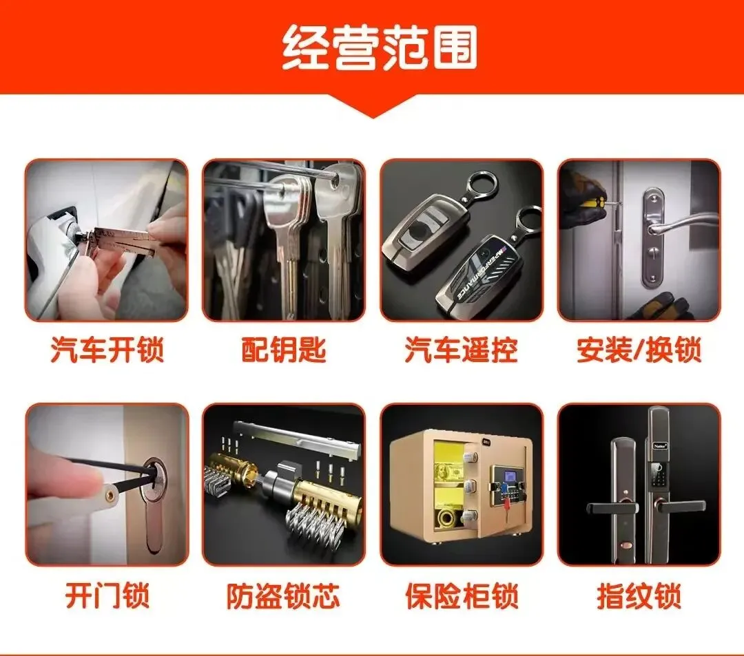 🛠️【服务内容】🔑 上门开锁(防盗门、室内门、汽车锁等)🔑 更换锁芯(B级/C级锁芯升级)🔑 锁具维修与安装(各种锁具故障处理)🔑 指纹锁/智能锁安装与调试🔑 保险柜开锁与维修🔑 汽车钥匙匹配、遥控开锁🔑 商铺、办公场所锁具维护与更换
