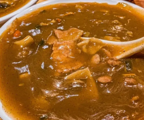 胡辣汤的做法也不复杂,牛骨或羊骨先熬底汤,再下胡椒、面筋、粉条、木耳和肉丁,最后用面浆收一收,让汤挂住料。火候到了,汤不是稀的,而是顺着勺背慢慢往下滑,辣里带鲜,早晨一喝,人就醒了。