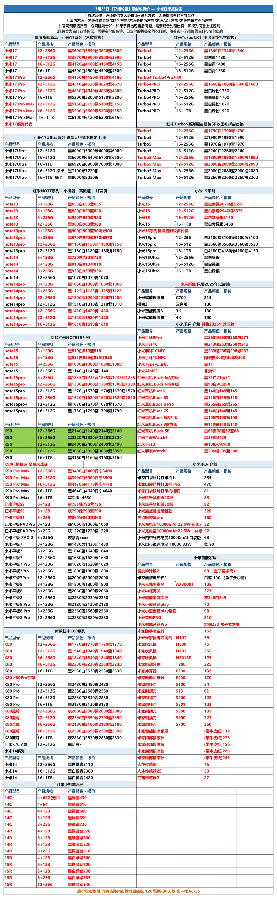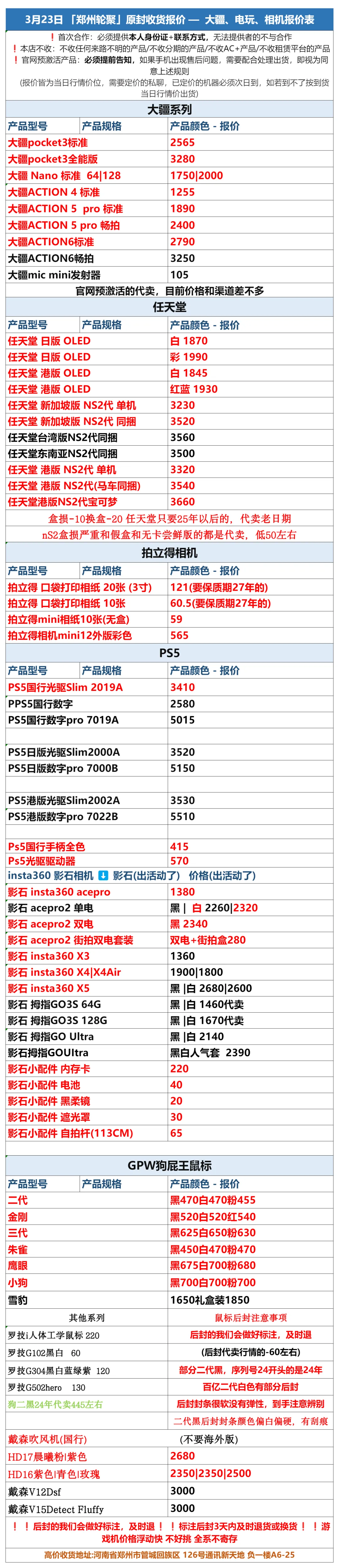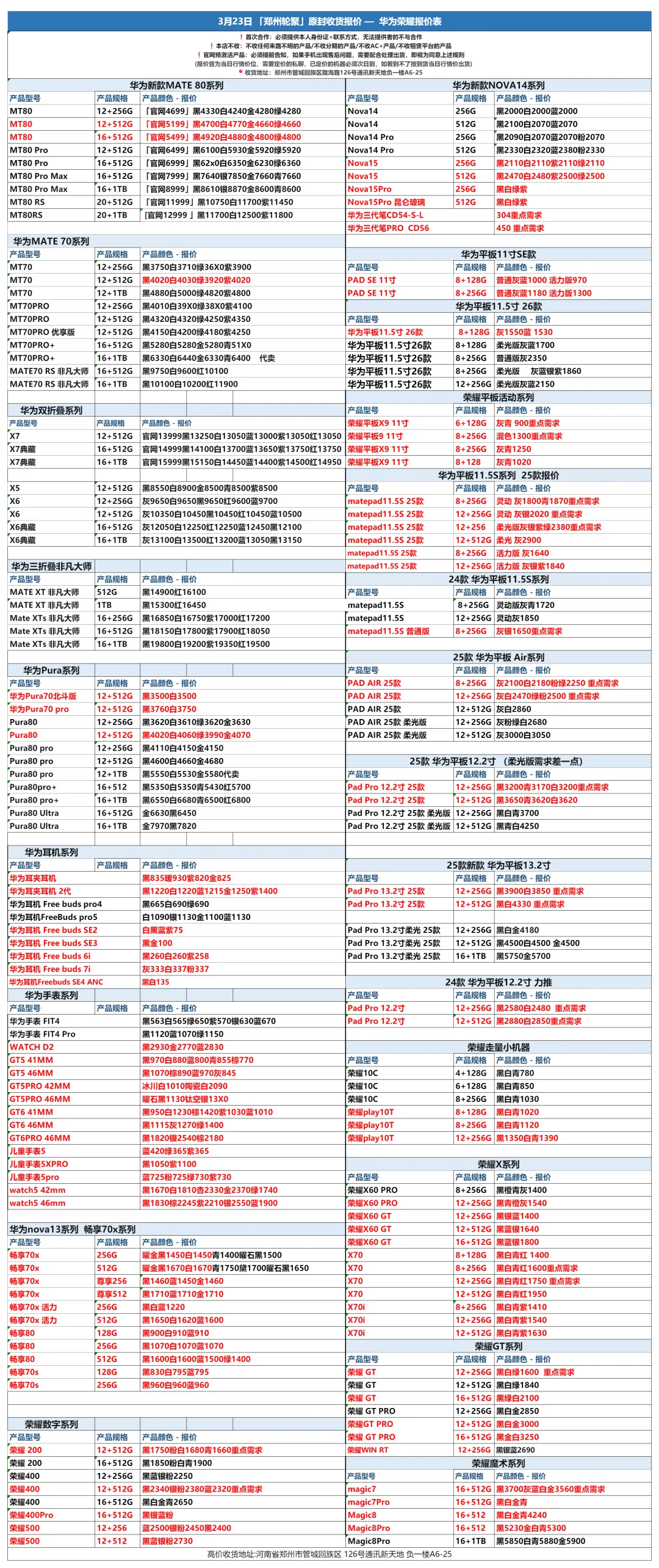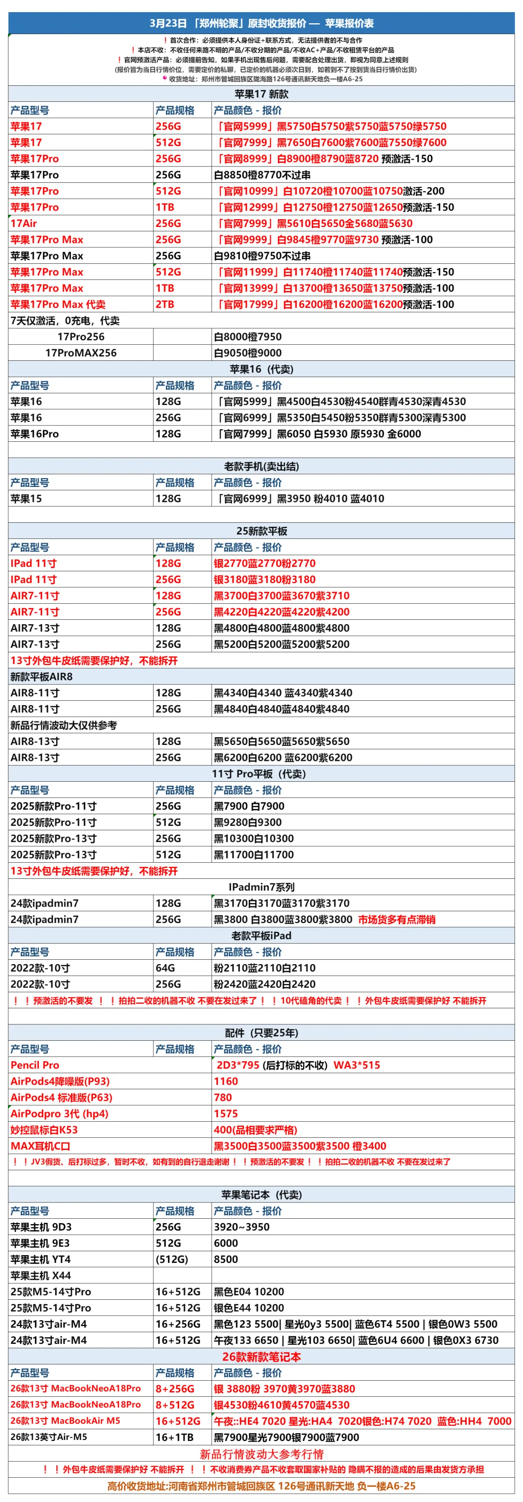 >郑州轮聚通讯 2026年3.23日数码报价更新