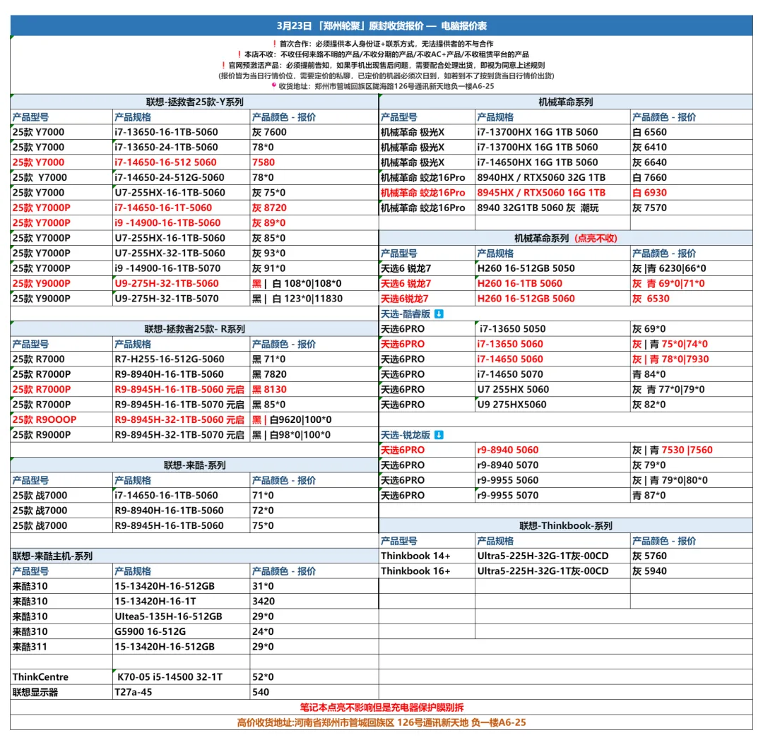 郑州轮聚通讯 2026年3.23日数码报价更新