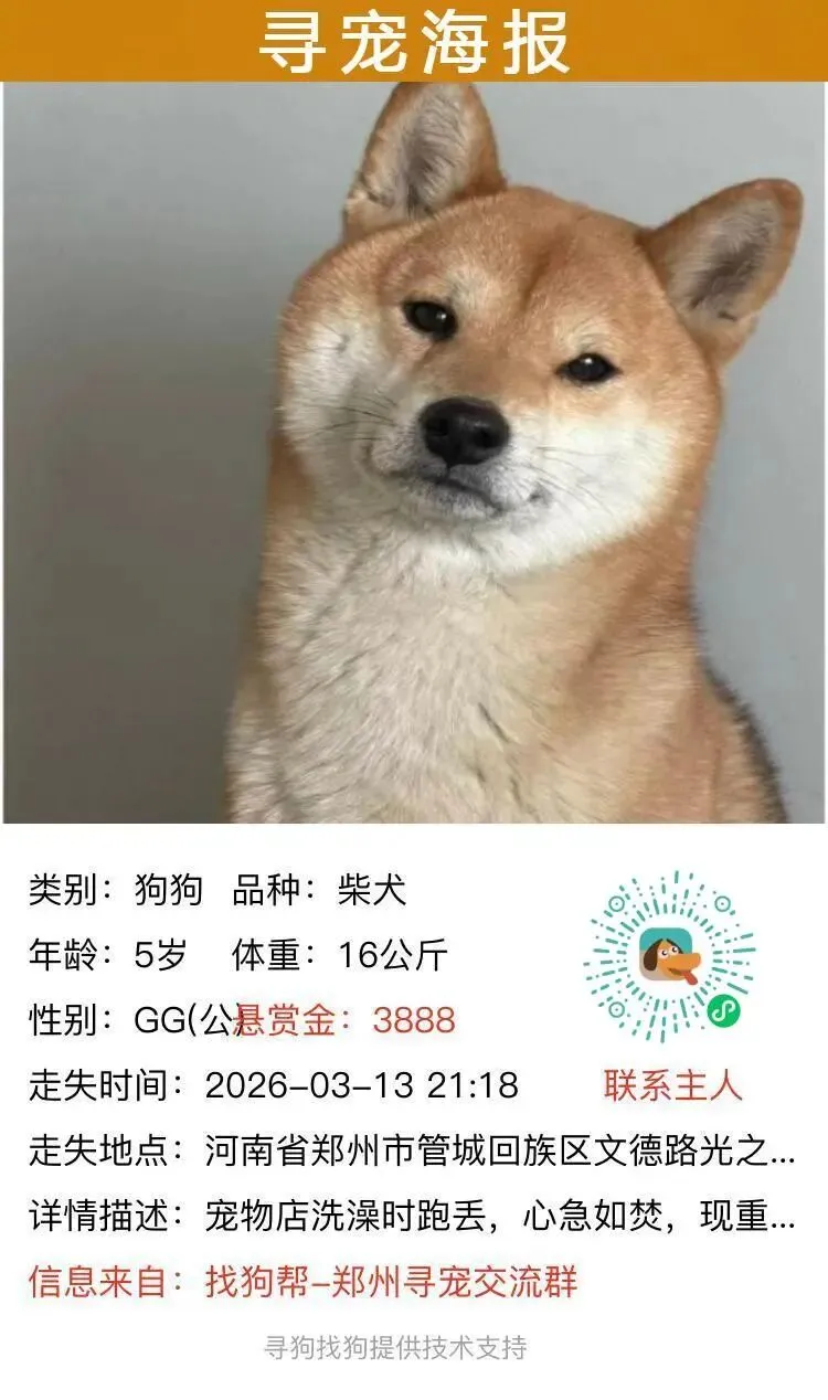 #郑州寻狗# 管城回族区文德路光之谷商业中心三号楼107商铺附近走失一只柴犬,如有好心人看到或者收留请联系主人或本平台