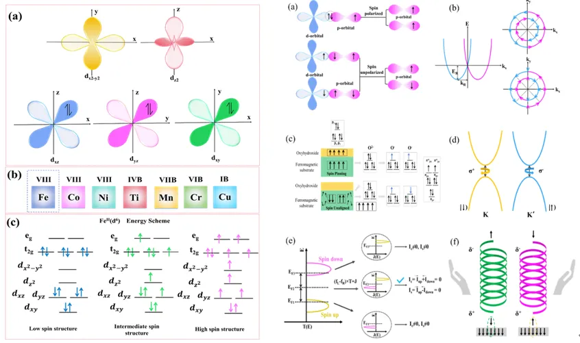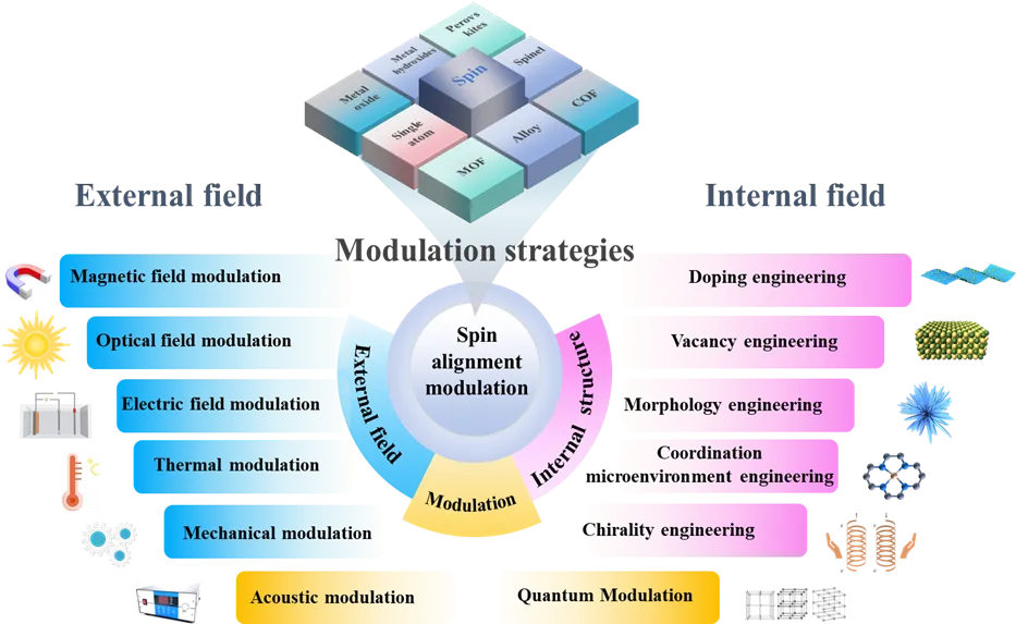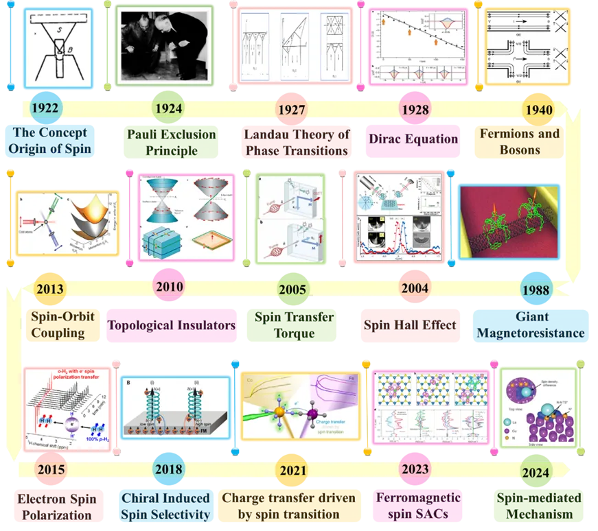 近日,郑州大学张佳楠与江苏科技大学张亮合作,在期刊Chemical Society Reviews上发表了题为“Spin-engineered catalysts: unlocking new frontiers in environmental and energy catalysis applications”的综述论文。该综述介绍了环境与能源催化在应对日益严峻的环境问题与能源匮乏背景下实现可持续发展中的重要意义,自旋构型在催化研究中的关键作用,以及其在各类催化反应与催化材料中的广泛应用。该论文系统探讨并总结了自旋电子态理论相关的基础概念,包括其历史发现、自旋取向、自旋与 d 轨道的关系,以及若干重要的自旋相关参数,如自旋极化、自旋极化态密度、自旋轨道耦合效应、自旋极化载流子、自旋钉扎效应以及手性诱导自旋选择性效应。随后,总结了催化电子自旋表征的技术方法,包括常用的表征手段及理论模拟方法。第三部分系统回顾了开壳层金属电子自旋调控的策略,包括催化剂内部场的调控以及外部能场的调控。第四部分则全面分析了自旋调控如何增强反应的热力学、动力学及稳定性,并阐释了自旋现象影响催化反应途径的作用机制。最后,作者展望了催化剂电子自旋的精确表征与标准化、自旋特性介导的结构-活性关系解析,以及电子自旋在催化中的实际应用发展前景。本节系统介绍了自旋的基本概念,追溯其自1922年提出以来的发展历程。同时,综述对物理学和化学领域自旋电子学的里程碑研究成果进行了详细回顾,涵盖至2024年的最新进展。系统介绍了自旋电子学中的相关参数,如自旋角动量及 d 轨道,以及若干关键自旋相关性质,包括自旋极化、自旋轨道耦合效应、自旋钉扎效应、自旋注入、自旋电流以及手性诱导自旋选择性。