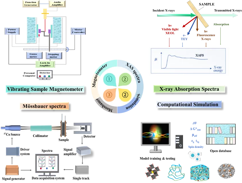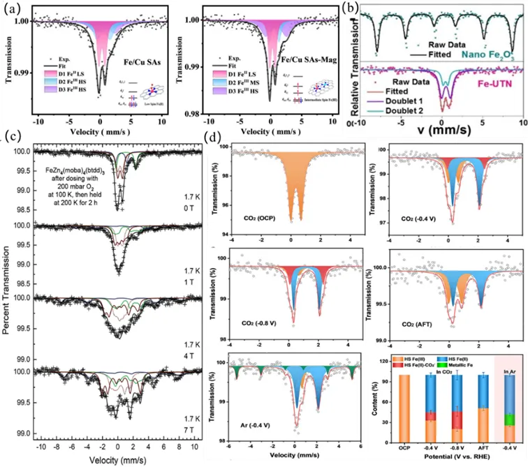 本节分类介绍了催化中自旋构型表征的主要技术手段,并深入解析了这些技术的基本原理,并配以典型表征案例。穆斯堡尔(Mössbauer)谱是一种 γ 射线吸收技术,可提供关于催化剂中金属氧化态、配位环境、电子密度及磁性质的重要信息。其中,异核位移(IS)和四极分裂(QS)等关键参数可用于判定原子自旋态。该技术尤其在结合原位测量时,可用于观测催化过程中动态自旋态的转变。