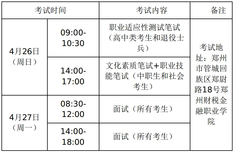 考生于4月26日登录 “郑州卫生健康职业学院招生信息网”网站(https://www.zzhvc.cn/zhaosheng)自行下载准考证并打印,2026年4月27日进行高职单招考试,具体考试时间以考生准考证为准,考试时无准考证和身份证不得入场。