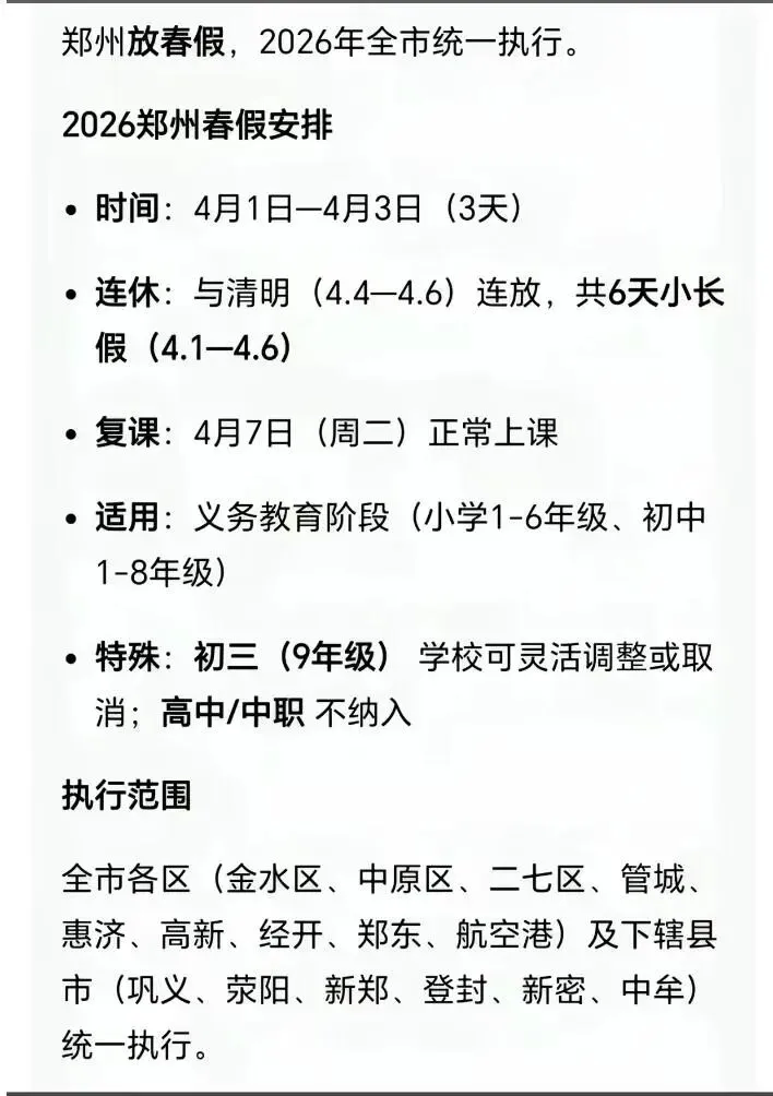 近日,网上多个平台账号发布“郑州市2026年放春假”的消息,称春假时间为4月1日至4月3日,并与清明假期(4月4日至4月6日)连休。