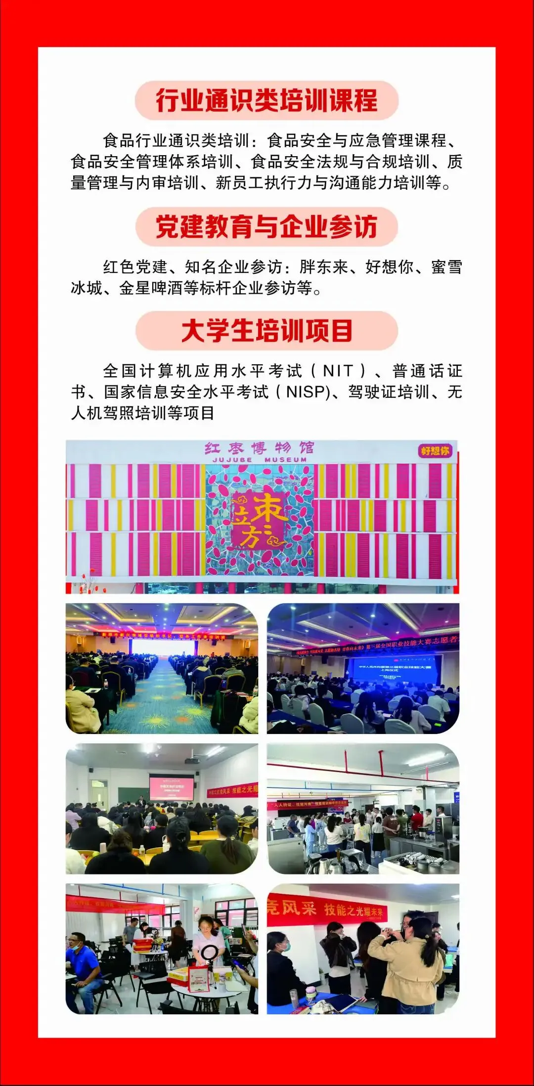 红色党建、知名企业参访:胖东来、好想你、蜜雪冰城、金星啤酒等标杆企业参访等。