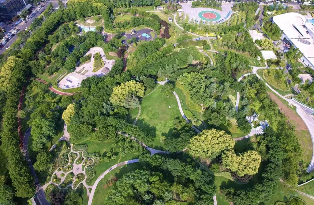 ✅亮点:该公园规划设计包含主入口区、体育健身区(乒乓场地多)、月季园、市树广场、苏园(特色园林)、山林康体等八个功能区。是体育健身与生态园林结合的典范。