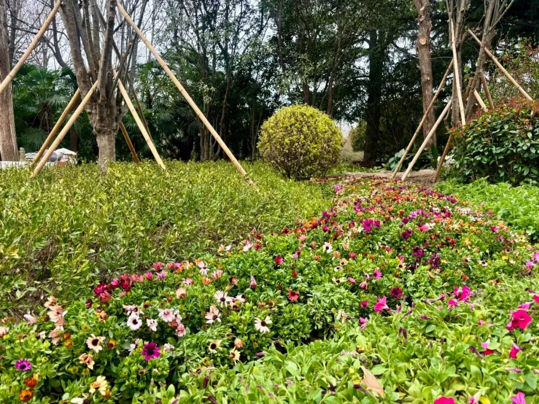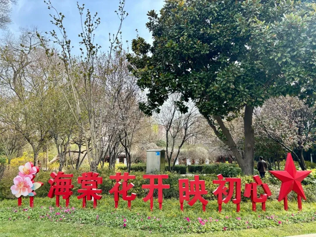 景观节点重塑。三个大门同步焕新迎客,南门以四组海棠景墙重塑入口空间,两侧取“东瓶西镜”之意,寄寓岁月安好、出入清宁;西门与北门则更新矮牵牛、美女樱等早春花卉,搭配海棠主题美陈展板,以明快色彩迎接八方来客。全园环路同步实施景观优化,以花境串联,织就一条贯穿全园的“海棠之链”。海棠大道南侧入口新设“海棠花开映初心”主题小品,将红色情怀融入满园春色,让这场春日之约,于繁花深处更添一份精神的回响。