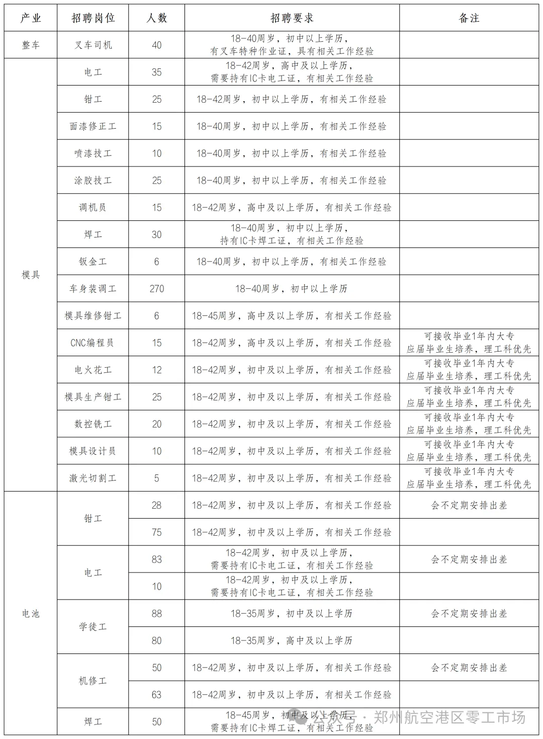 郑州园区3月份招聘普工500人,招聘技工1000余人,所有招聘岗位均为比亚迪直招(认准官方平台),请勿相信有偿推荐骗局。入职即签订正式劳动合同,缴纳五险一金。