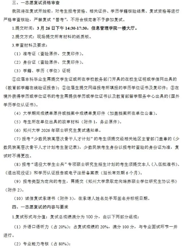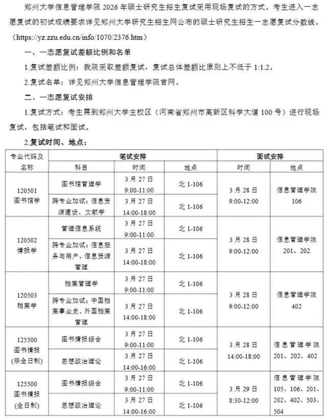 郑州大学信息管理学院2026年硕士研究生一志愿复试录取工作实施细则