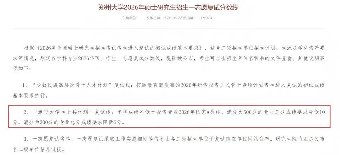 重点信息:(“退役大学生士兵计划”复试线:单科成绩不低于报考专业2026年国家A类线,满分为500分的专业总分成绩要求降低10分,满分为300分的专业总分成绩要求降低6分。)