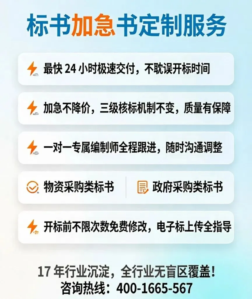 全流程闭环服务: 提供从招标文件解读、投标策略制定,到电子标书制作、CA锁签章、平台上传指导,直至开标注意事项提醒的全流程一对一专属跟进。在招标文件无实质性变更的前提下,开标前提供不限次数的免费修改优化服务。