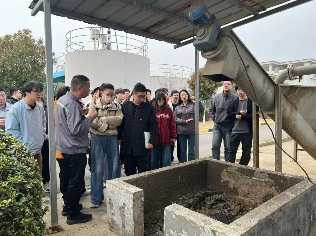 在工作人员的带领与细致讲解下,同学们先后参观了厂区膜工艺展示区与生产现场。工作人员结合展板内容,系统介绍了厂区以MBR膜生物反应器为核心的处理工艺、运行流程及环保成效。在生产现场,详细讲解了污水从预处理格栅除杂、沉砂,到生物池活性污泥降解污染物,再经过滤膜组件进行高精度固液分离,最终实现深度净化达标排放的全流程。同学们认真聆听、驻足观看,积极与工作人员交流探讨,直观了解污水经膜技术深度处理变清流的全过程,深刻认识到水资源保护与生态治理的重要意义。