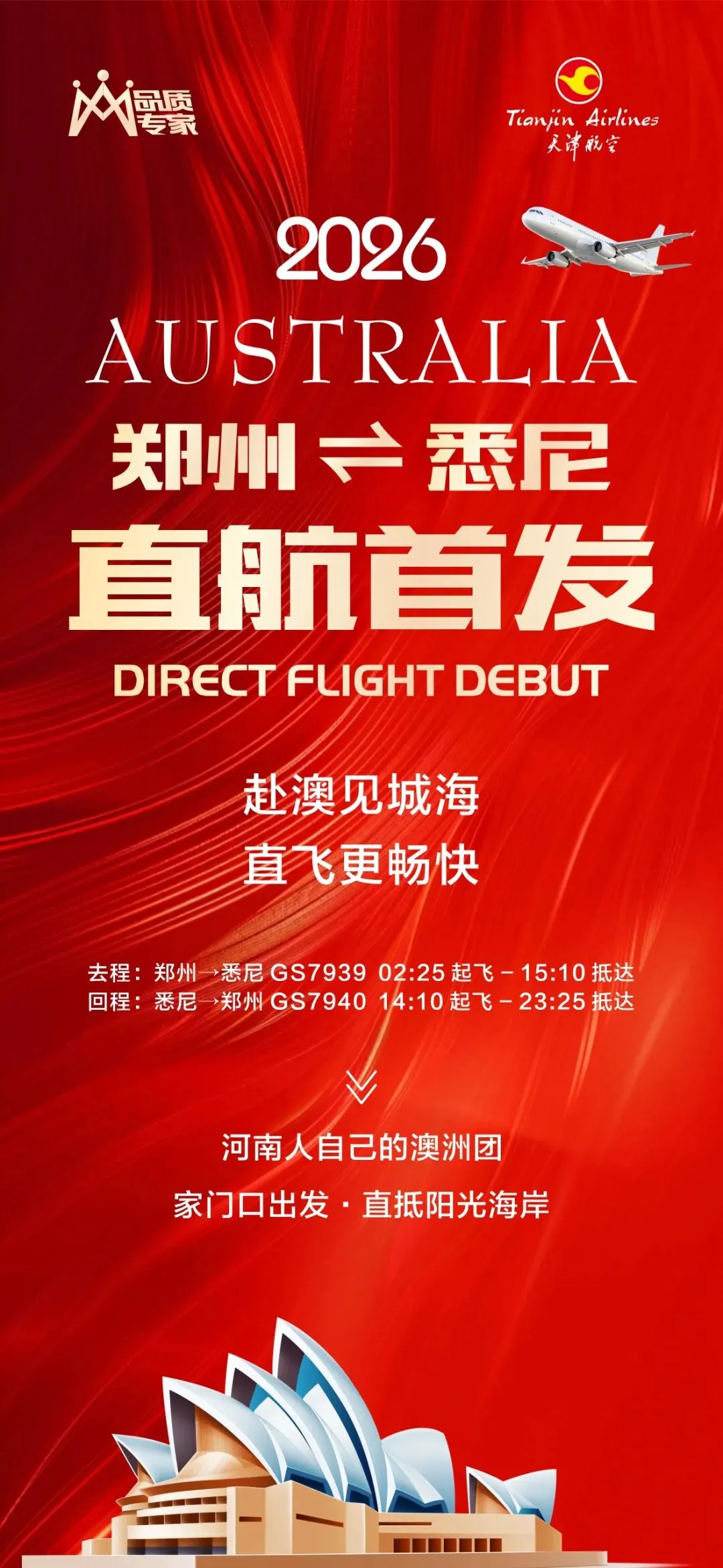 郑州直飞澳大利亚悉尼,直航独家首发!告别转机劳顿,省下8小时多玩一整天——河南独享直飞特权!席位限量,即刻锁定!