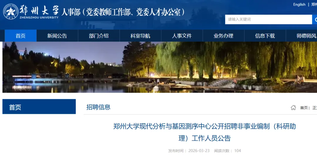 / 【郑州大学】现代分析与基因测序中心科研助理招聘 4 人|劳务派遣|4.8 报名截止 /