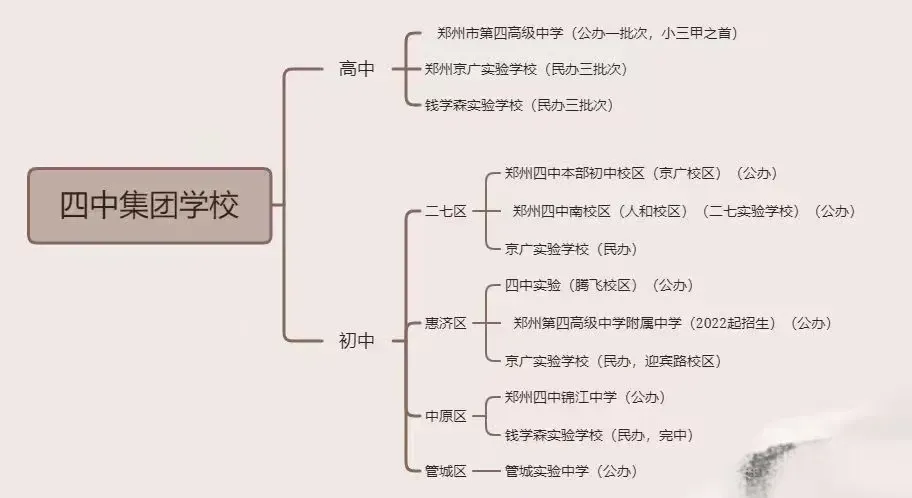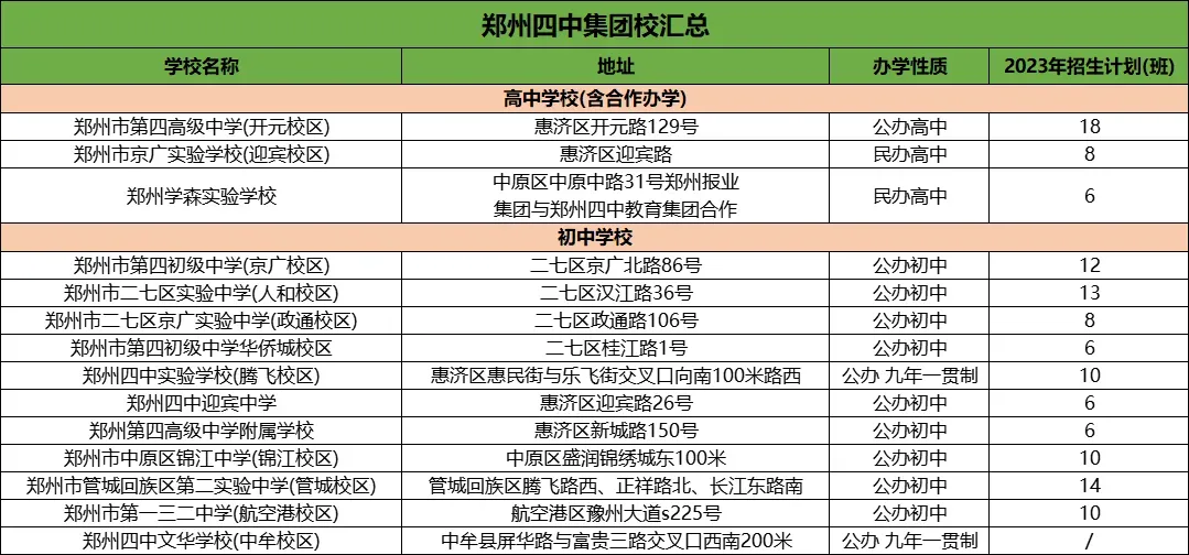 郑州市第四初级中学、郑州市二七区实验中学、郑州市二七区京广实验中学、郑州市第四初级中学华侨城校区、郑州四中实验学校、郑州四中迎宾中学、郑州第四高级中学附属学校、郑州市中原区锦江中学、郑州市管城回族区第二实验中学、郑州市第一三二中学、郑州四中文华学校。
