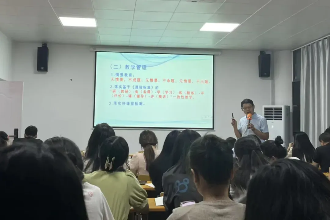 标准教室教学规范集中培训。培训内容包括上课规范、辅导规范、晚自习值班要求,培训细致到上下课的礼仪、学生坐姿、小组合作的话题选择、理答用语的多样性等。