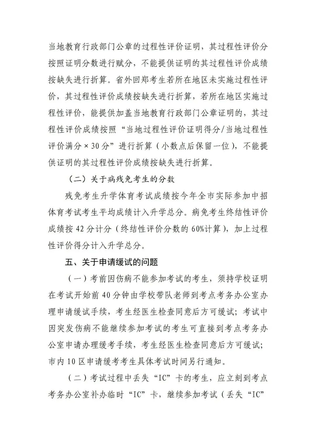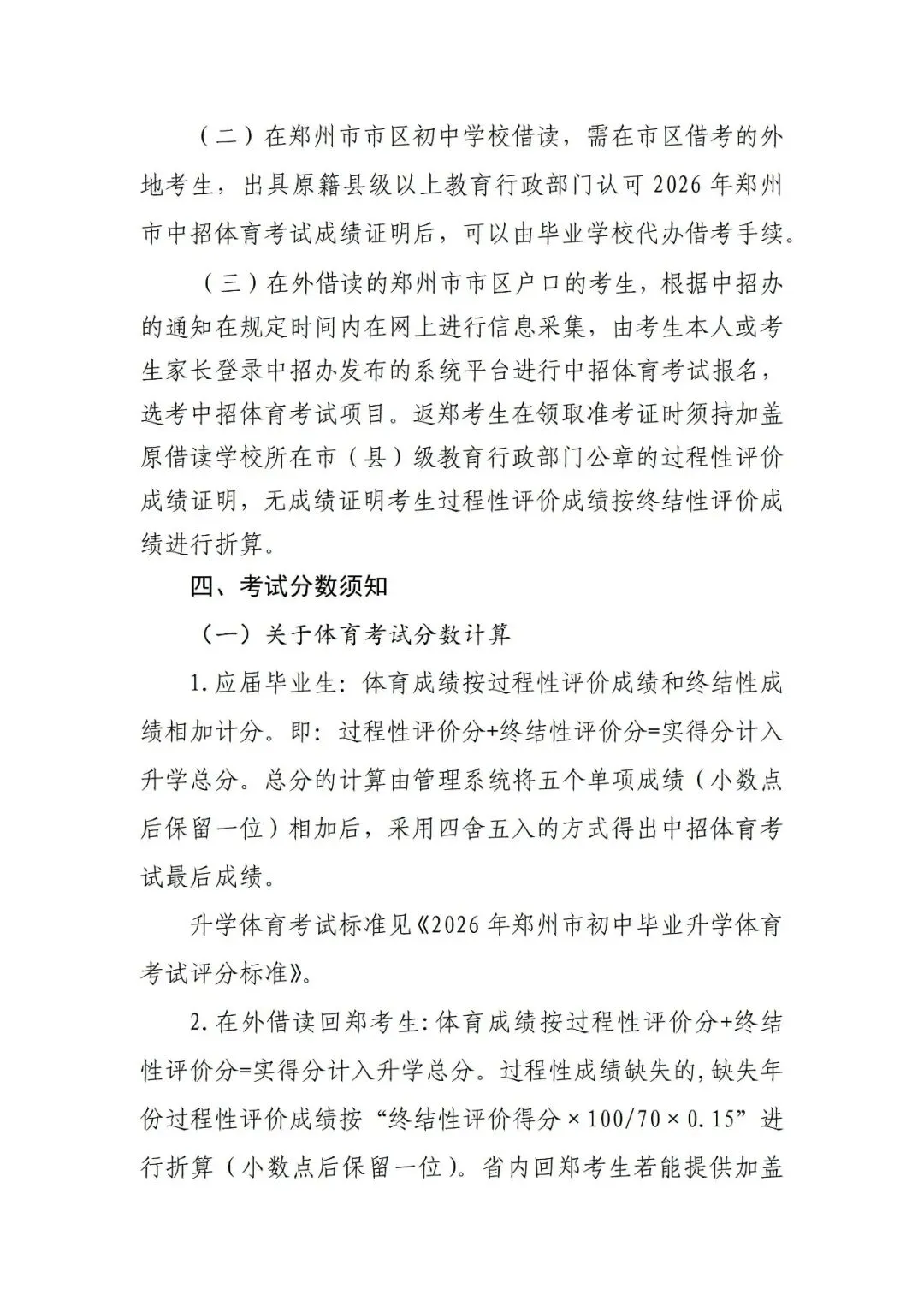 1.应届毕业生:体育成绩按过程性评价成绩和终结性成绩相加计分。即:过程性评价分+终结性评价分=实得分计入升学总分。总分的计算由管理系统将五个单项成绩(小数点后保留一位)相加后,采用四舍五入的方式得出中招体育考试最后成绩。
