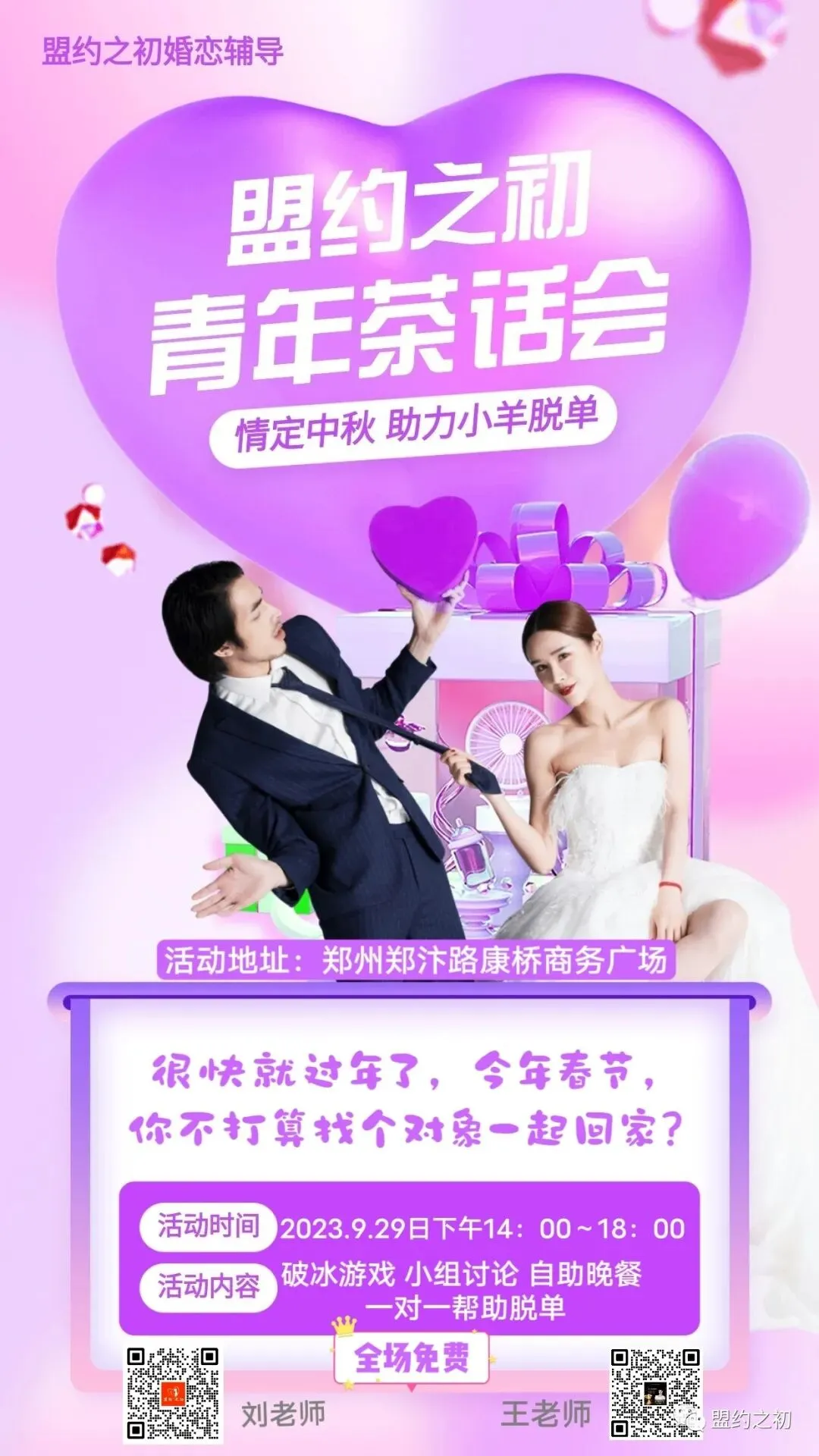 《盟约之初》青年茶话会《第二十三期》开始报名啦……活动时间:2023.09.29日 下午14:00~18:00活动地点:郑州市郑汴路康桥商务广场活动内容:破冰游戏/现场问答/心动互选/一对一帮助脱单活动费用:全场免费名额有限,报名从速!帮助扩散,能帮助到更多的单身弟兄姊妹们。