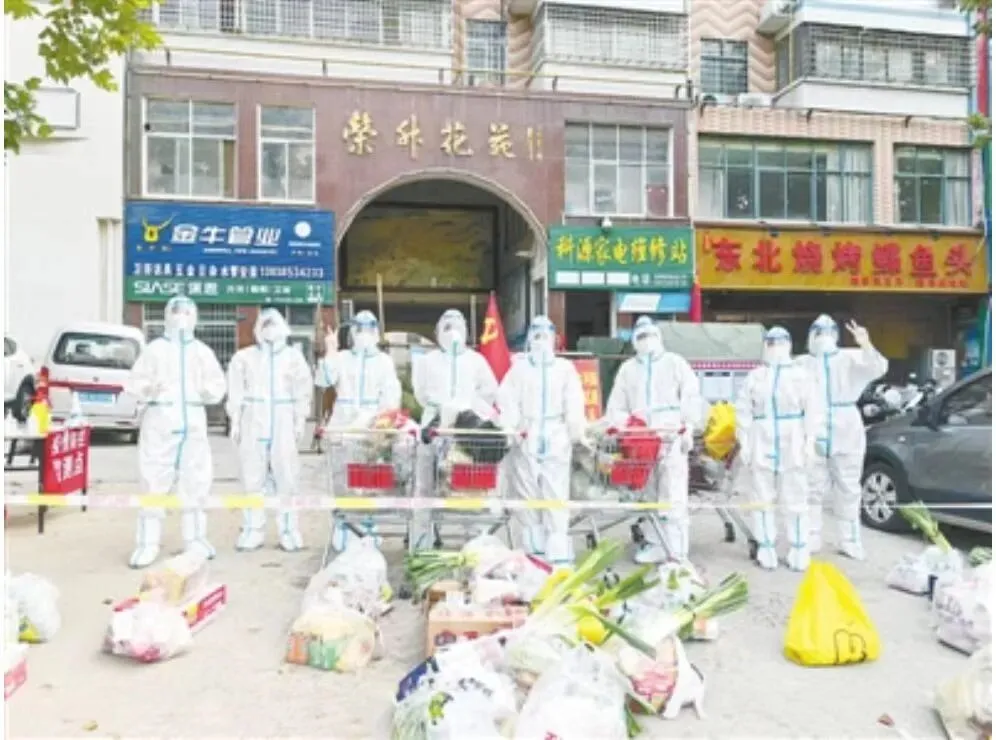 市城市管理局第一时间抽调80名精兵强将,组织成立4支疫情防控志愿服务队,化身“志愿红”和“大白”,积极参与核酸检测、信息采集、卡点值守、送餐保障,十八般武艺样样精通。市城市管理执法支队柳建国、温法彬、李广涛、张东瑞、马超5名同志,在中原区洛达庙社区担负起由“社区门”到“家门”的物资配送任务。在某工地隔离点,5名同志化身“大白”,一日三次为该工地100余名隔离人员送饭和生活物资,工地路没修好,他们就抬着走过去,电梯关停,他们徒步爬30层楼,逐一把饭和物资送到隔离户的门口。