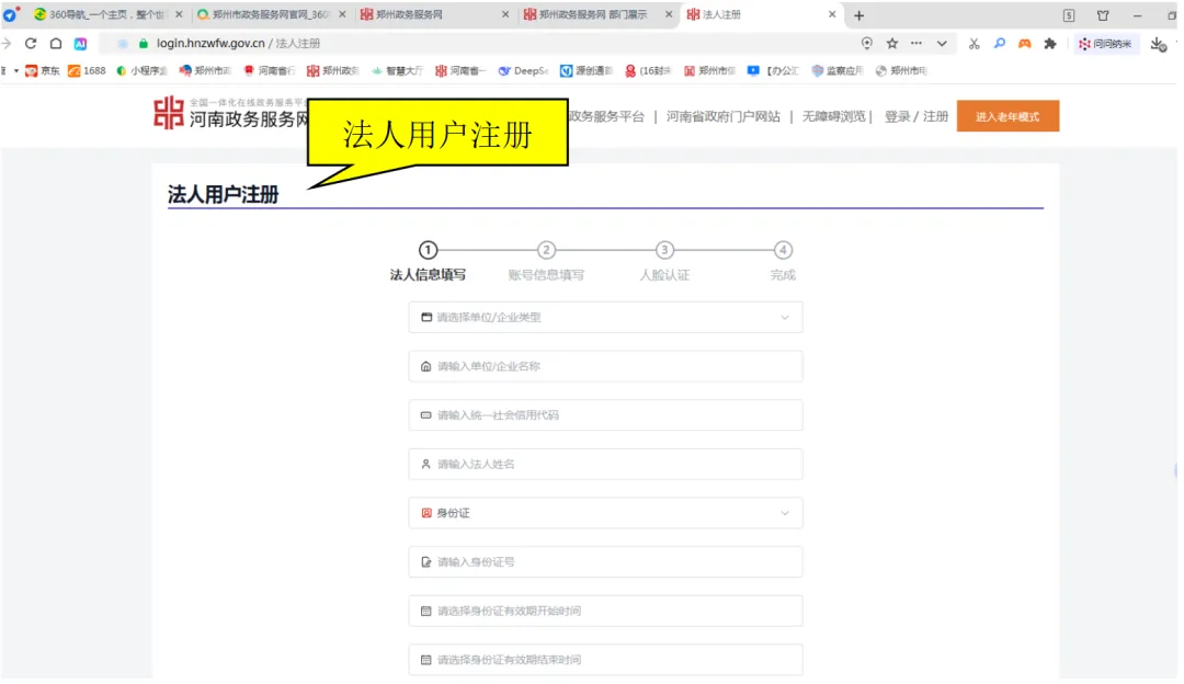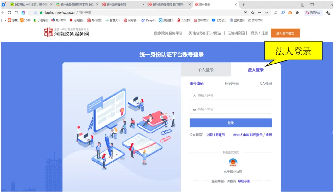 浏览器搜索“郑州市政务服务网”或直接输入网址进入官网,点击注册法人账户,并用法人账号登录。