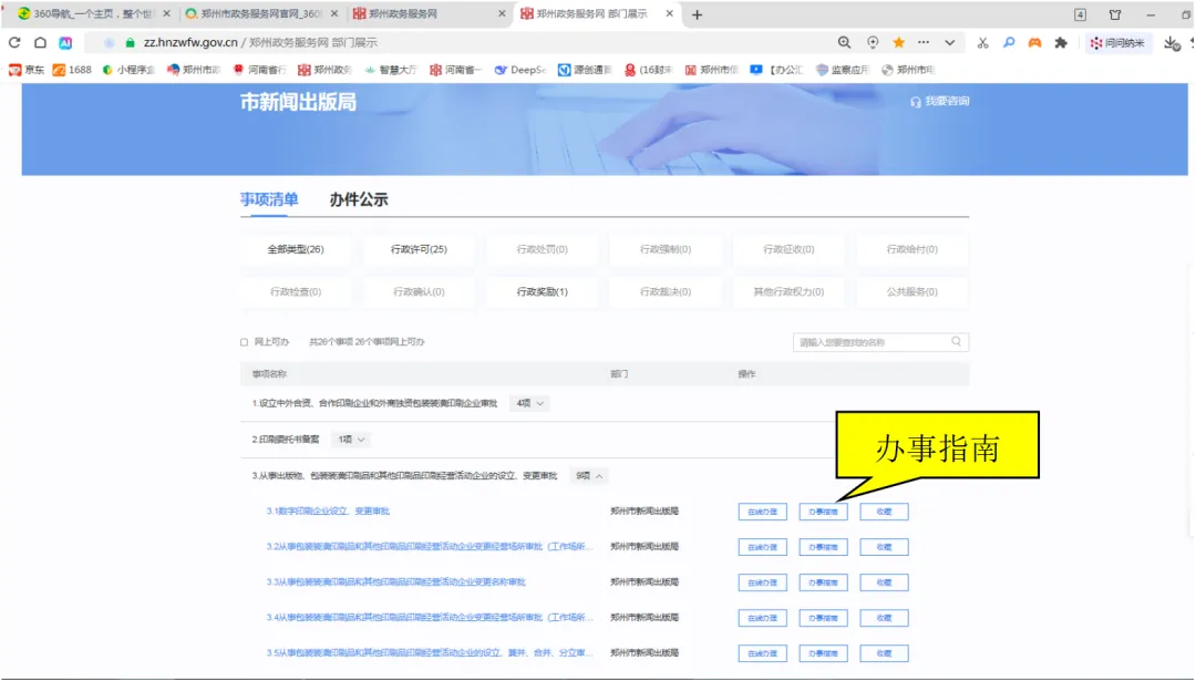 登录郑州政务服务网(https://zz.hnzwfw.gov.cn/),点击首页“部门服务”,选择“市新闻出版局”。在事项清单中找到您要办理的业务,进入“办事指南”页面,即可详细了解办理流程,并下载“办理材料”清单,按需准备,一步到位!
