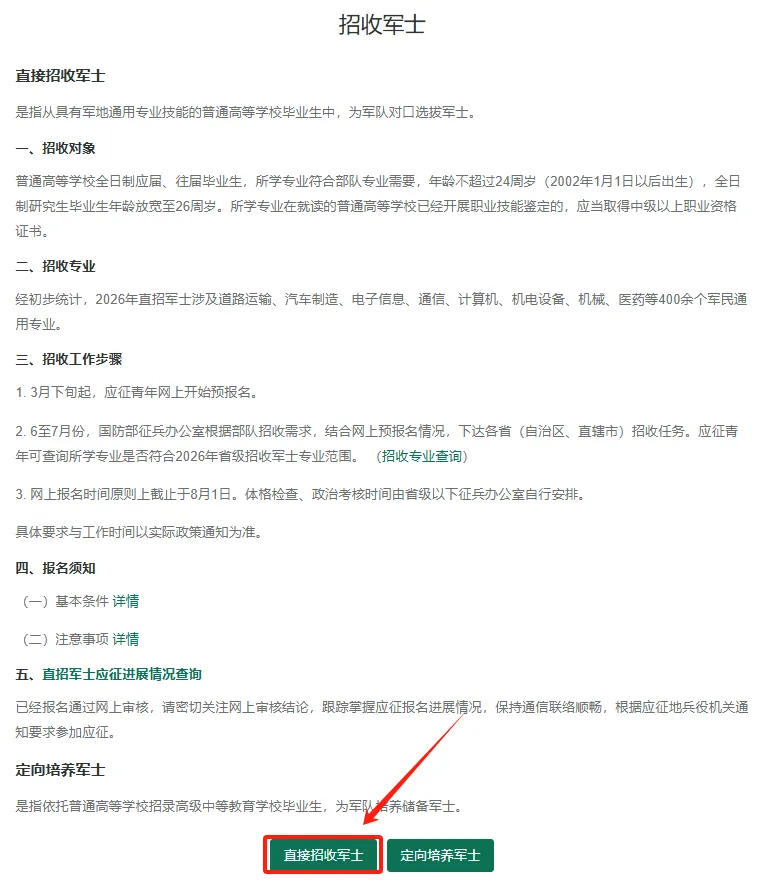 3.因应征地招收军士专业和计划限制,未能被确定为直招军士送检对象的,还可根据应征地兵役机关安排参加义务兵征集。