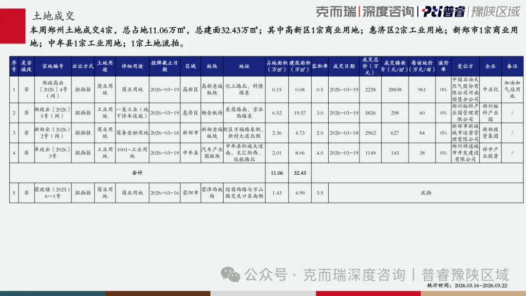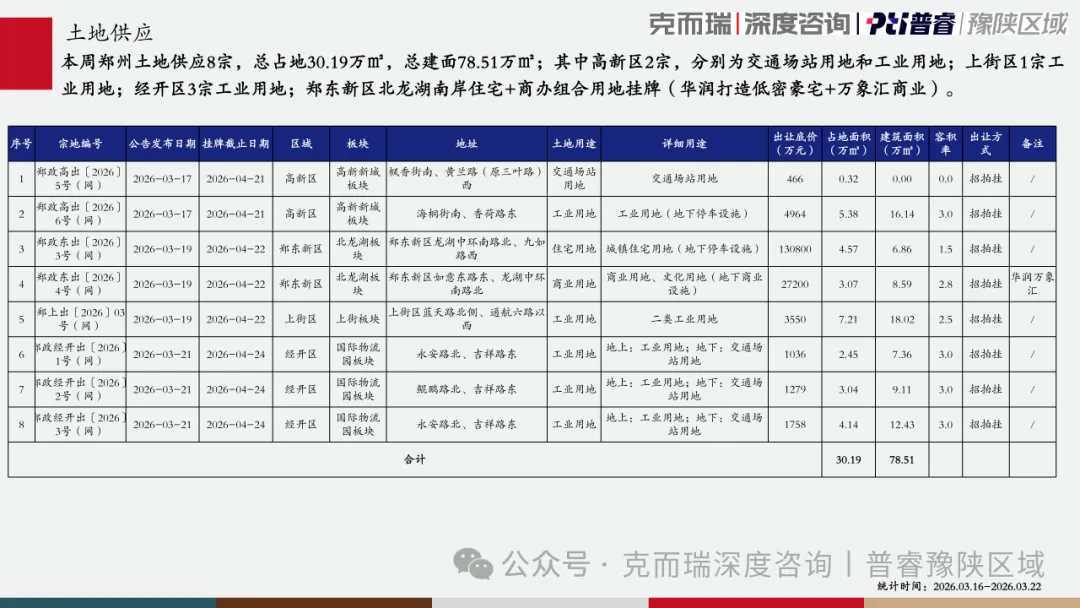 本周推出8宗地块,总占地30.19万㎡,含郑东新区北龙湖住宅+商办组合用地,与带方案出让政策导向相呼应;成交4宗地块,以工业、商业用地为主,无溢价成交,1宗商业用地流拍。