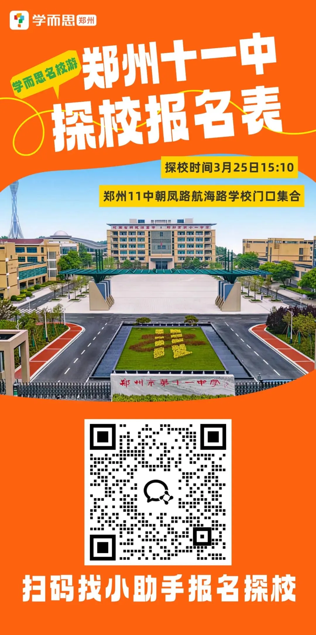 明天下午15:10分,我们将在11中学校门口集合签到,进入学校探校,大家可以扫码找小助手老师报名探校哦