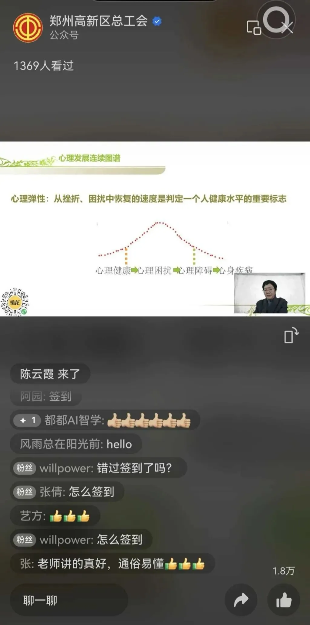 郑州高新区总工会深入贯彻上级工会关于加强职工心理健康服务的工作部署,围绕职工实际需求,创新服务形式,于近日成功举办首次线上专项心理健康培训。本次活动主题为“心理学入门与自我觉察”,吸引了全区众多企业职工的广泛参与,实时在线学习人数约1900人,取得了良好效果。
