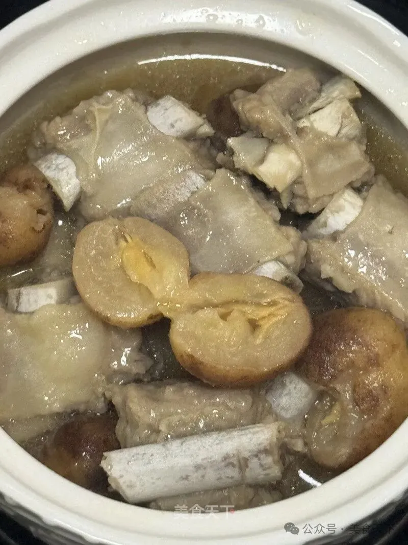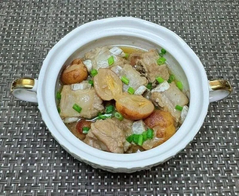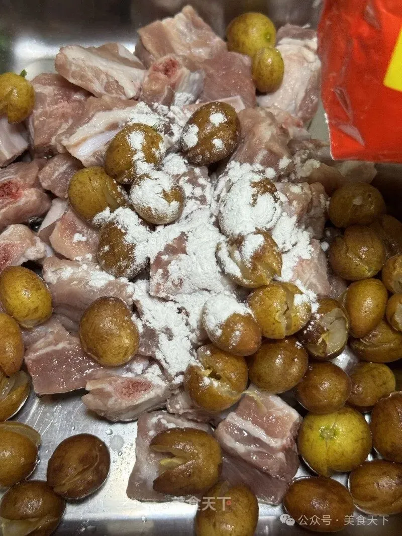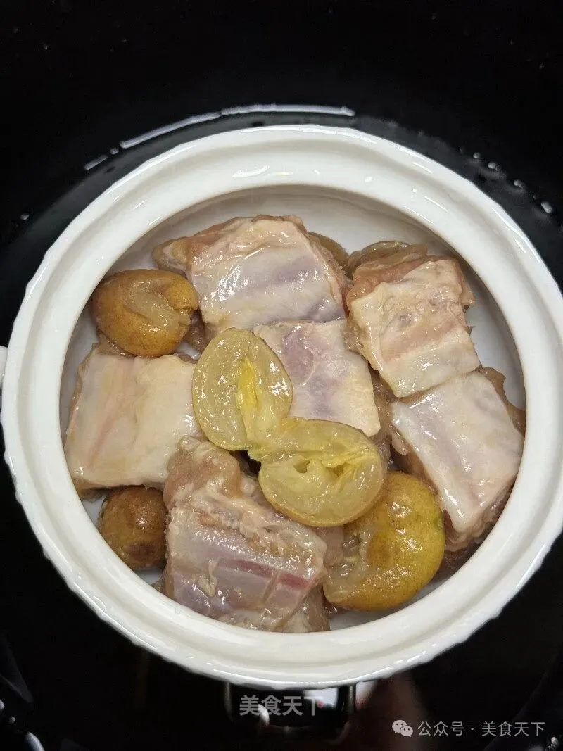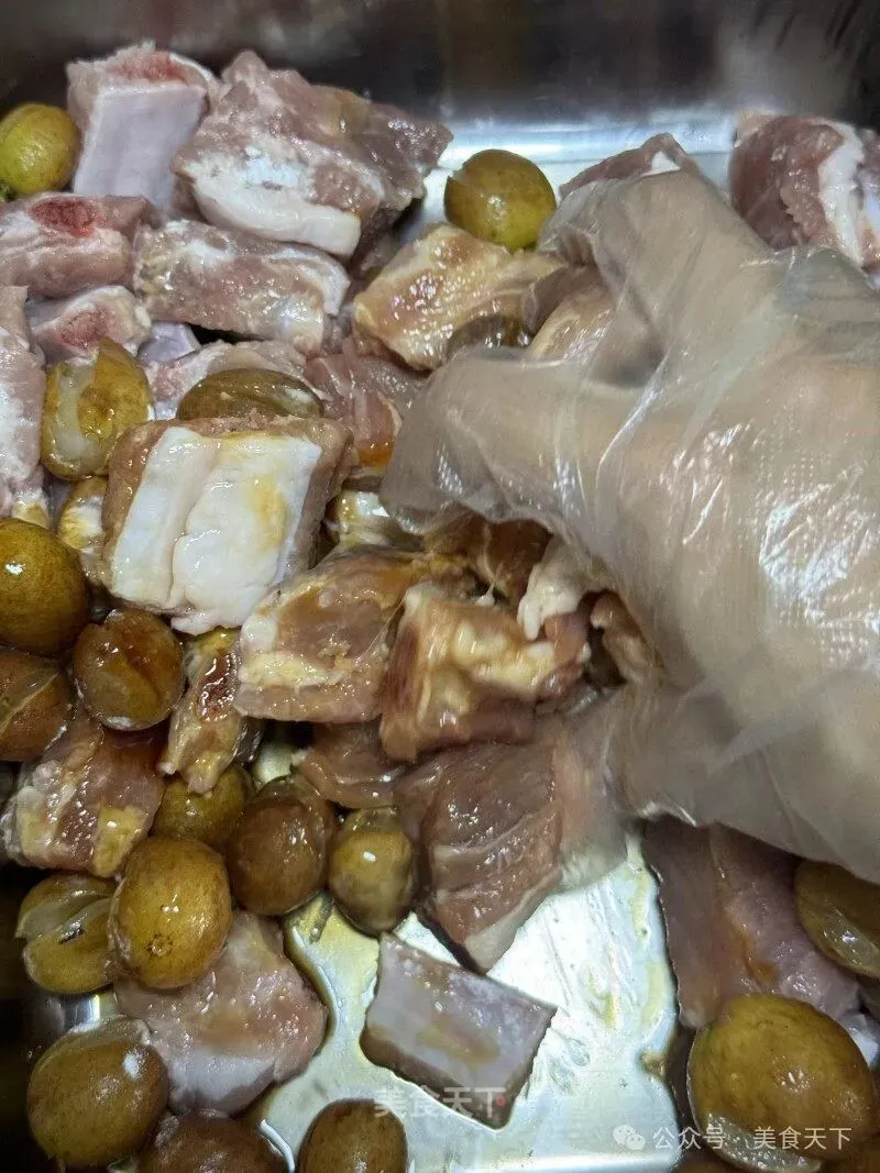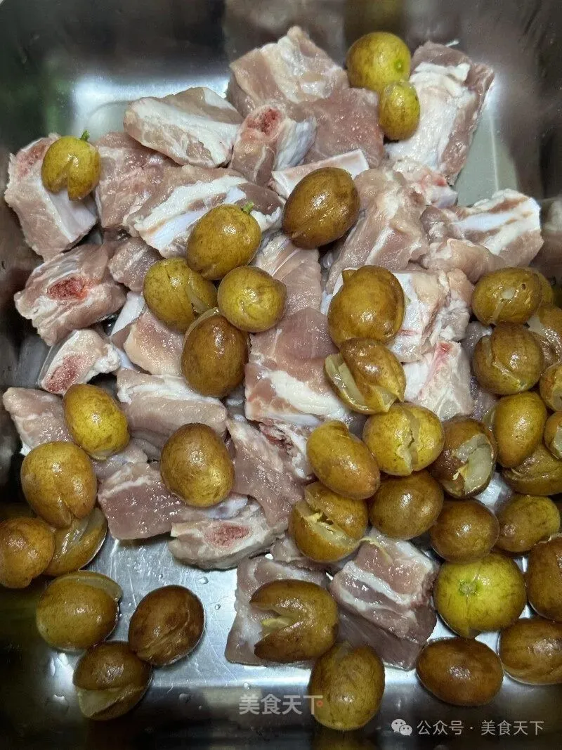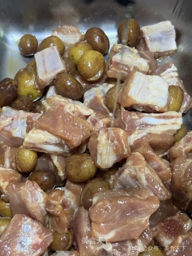 3. 黄皮剪开去核,放入排骨里。