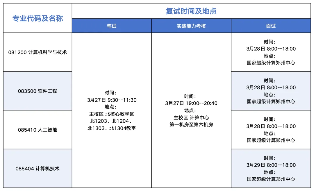 除专业课笔试外,其它复试内容与形式计算机科学与技术(081200)、软件工程(083500)计算机技术(085404)人工智能(085410)四个专业相同。