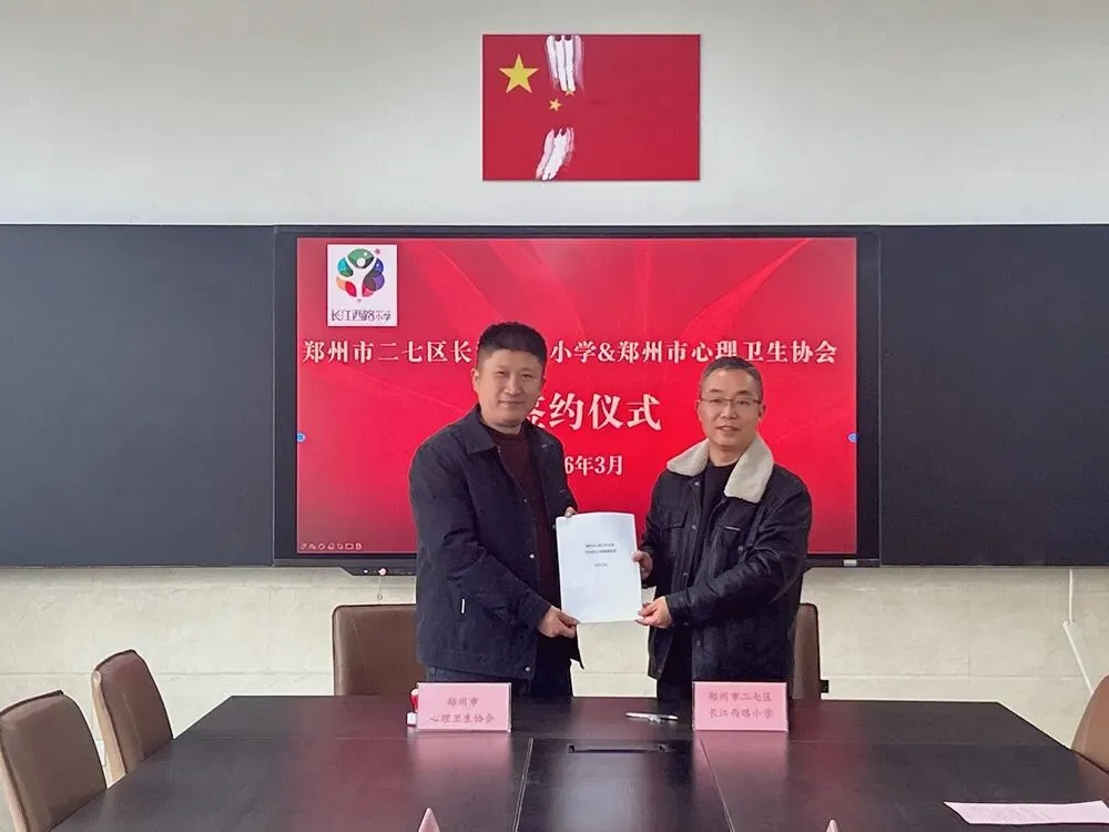 二七区长江西路小学党支部书记、校长李小建、副校长刘乐,郑州市心理卫生协会副秘书长刘一宏、协会智库团成员董小丽共同出席了本次签约仪式。在众人的见证下,协会副秘书长刘一宏与校方支部书记、校长李小建共同签署了合作协议。双方将充分发挥各自优势,整合专业资源,积极构建家校社协同育人机制。通过全方位、多层次的合作,为师生心理健康筑牢坚实保障,推动校园心理健康教育工作迈向新的台阶。