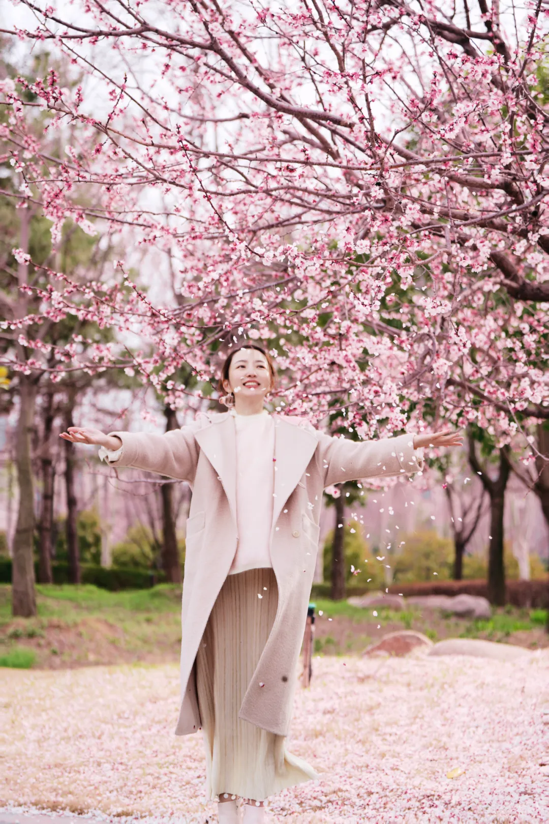 📷:人物占比小,目的为凸显花的壮观,打造视觉冲击感。让模特坐在河边,拍摄远景和背景,增加故事感。