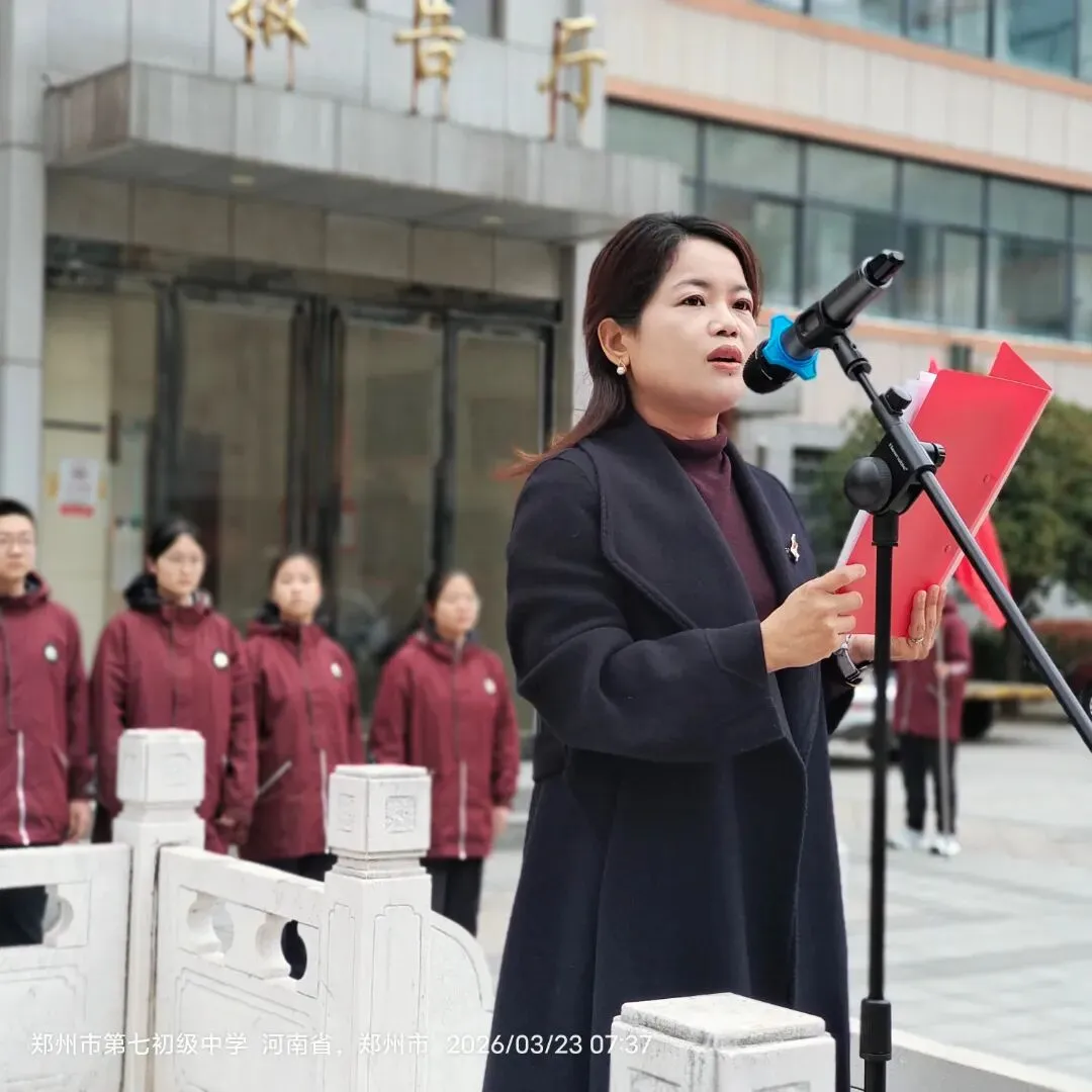 春回大地,万象更新。迎着清晨的朝阳,郑州市第七初级中学九年级举行2025-2026学年下学期第四周升旗仪式暨成长动员大会,以庄严的仪式凝聚奋进力量,以昂扬的姿态奔赴成长新程。升旗仪式开始,伴随着雄壮的《义勇军进行曲》,鲜艳的五星红旗冉冉升起,全体师生肃立注目,行注目礼,嘹亮的国歌响彻校园,彰显着七中学子赤诚的爱国情怀与蓬勃的青春朝气。
