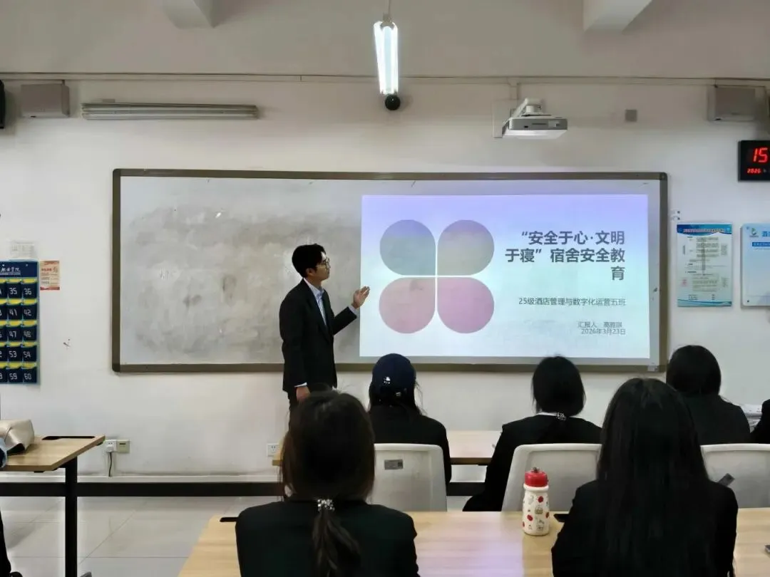为深入学习贯彻全国两会精神,筑牢校园安全健康防线,引导学生明晰职业方向、勇担时代使命,以昂扬姿态开启新学期征程近日,郑州旅游职业学院酒店管理学院在敏行楼开展2025-2026学年第二学期第三次主题班会。班会围绕“聚焦两会明方向·挺膺担当向未来”“安全于心·文明于寝”“预防为主·健康同行”“启智润心·赋能成长”四大主题,扎实推进思想引领与素质培育,为学生成长成才保驾护航。