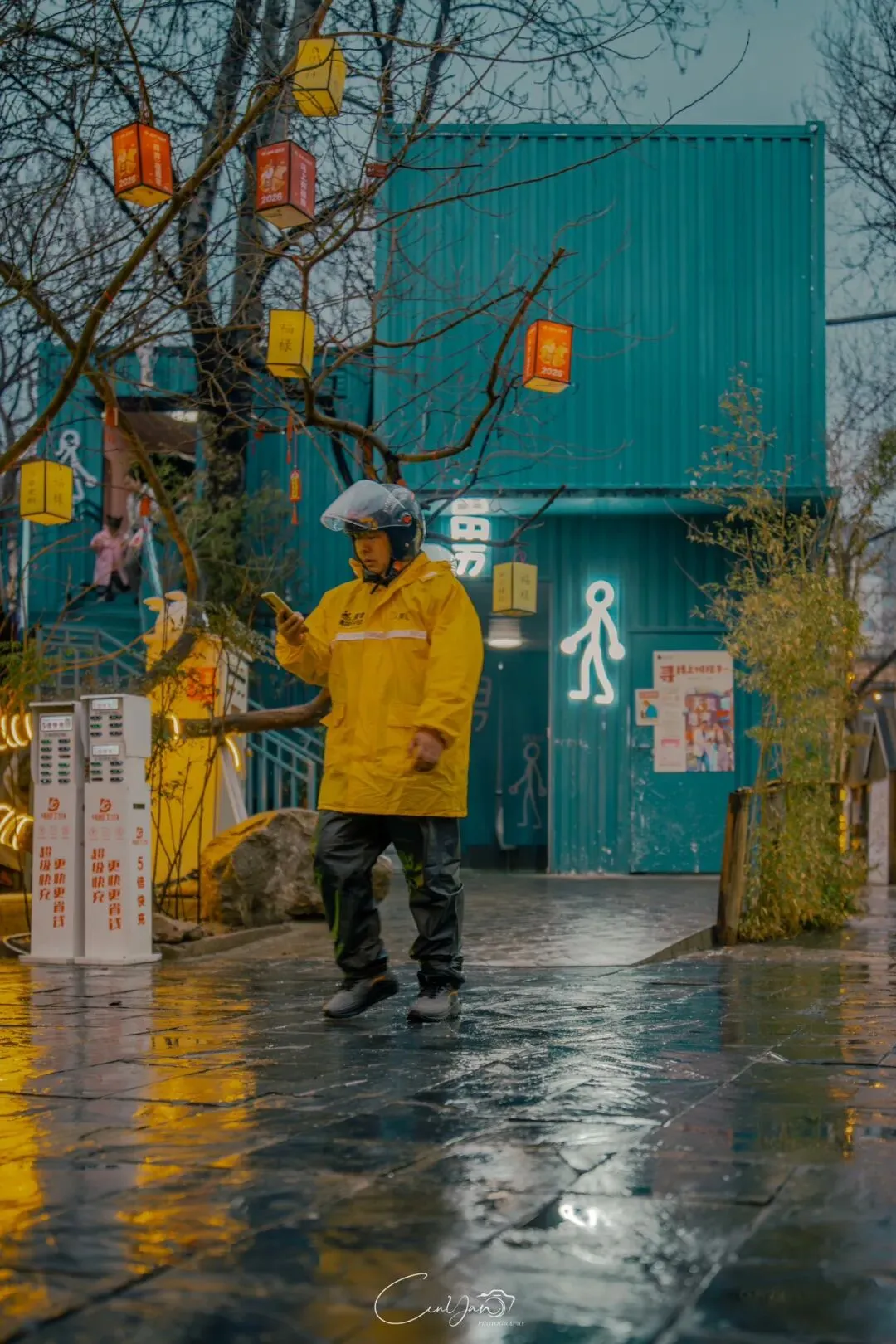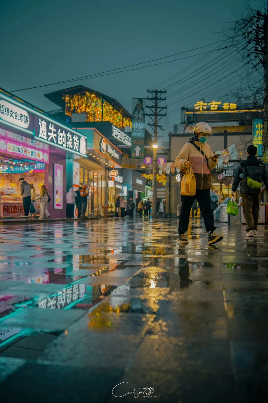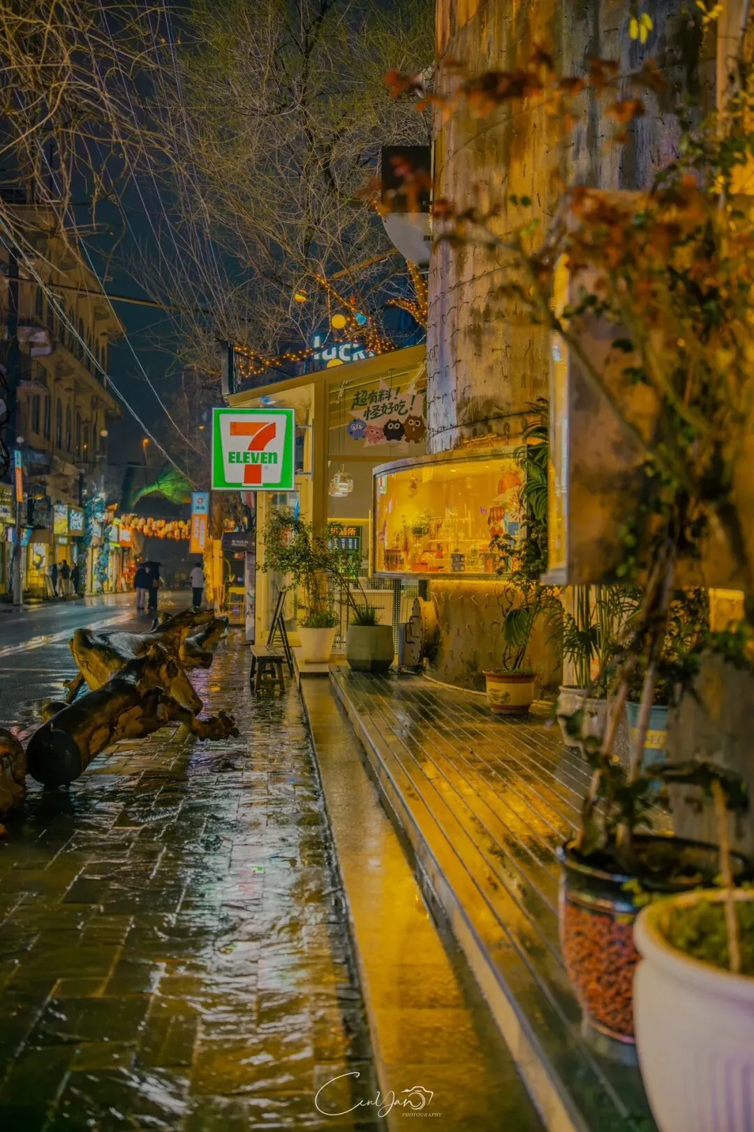 我拍了很多张照片,有霓虹闪烁的街巷,有倒影成双的牌坊,有安静伫立的老罐体,也有被雨水打湿的温暖灯箱。每一张里,都有雨,有光,有水,也有我对这座城市藏不住的喜欢。